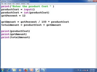 This document provides an introduction to the Python programming language. It discusses Python's design philosophy emphasizing readability. It also covers printing messages, reading input, variables and data types, operators, and basic syntax like comments and identifiers. Arithmetic, relational, logical and bitwise operators are explained along with examples.