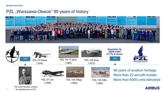 PZL Warszawa Okecie SA has over 90 years of aviation history in Poland, having designed and produced over 22 aircraft models and delivered over 6,000 units. Some of their notable aircraft include the PZL-23 Karas, PZL-37 Los, PZL-104 Wilga, PZL-106 Kruk, and PZL-130 Orlik. Currently, they focus on opportunities to grow their business in areas like aerostructures, electrical harnesses, space components, engineering services, and military maintenance and training with the Orlik aircraft. They have made investments in capabilities like a clean room for space components and digital transformation of their manufacturing processes.