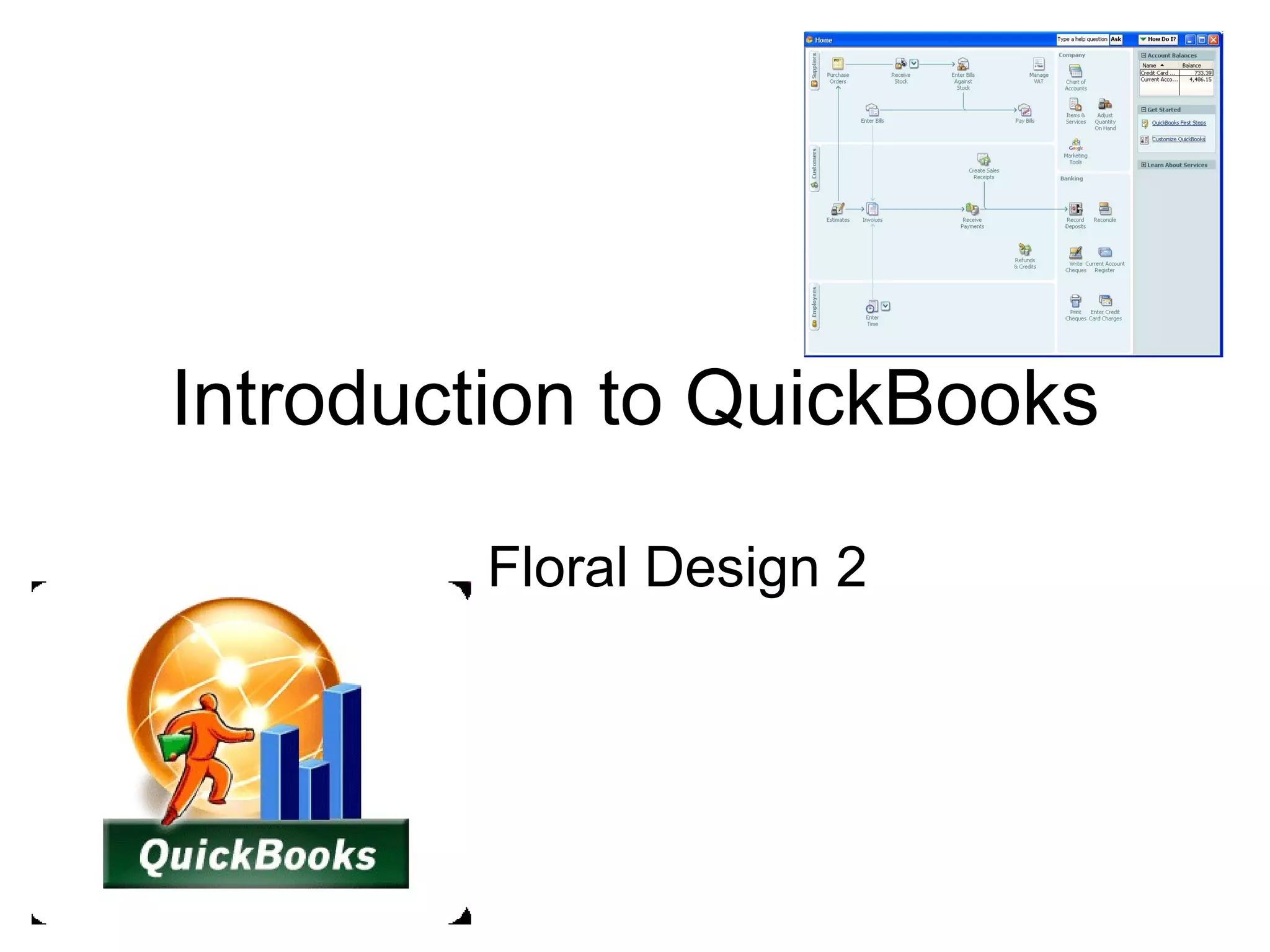 The document provides an introduction to using QuickBooks accounting software for bookkeeping tasks related to a flower shop. It outlines how to create sales receipts for cash transactions and invoices for later payments. It also covers how to record received payments against invoices to track open balances. The document reviews specific flowers that will be used in arrangements, including their names, costs, uses, longevity and how they are sold. It prompts planning arrangements and marketing for Valentine's Day using the available flowers within a $10 wholesale budget.