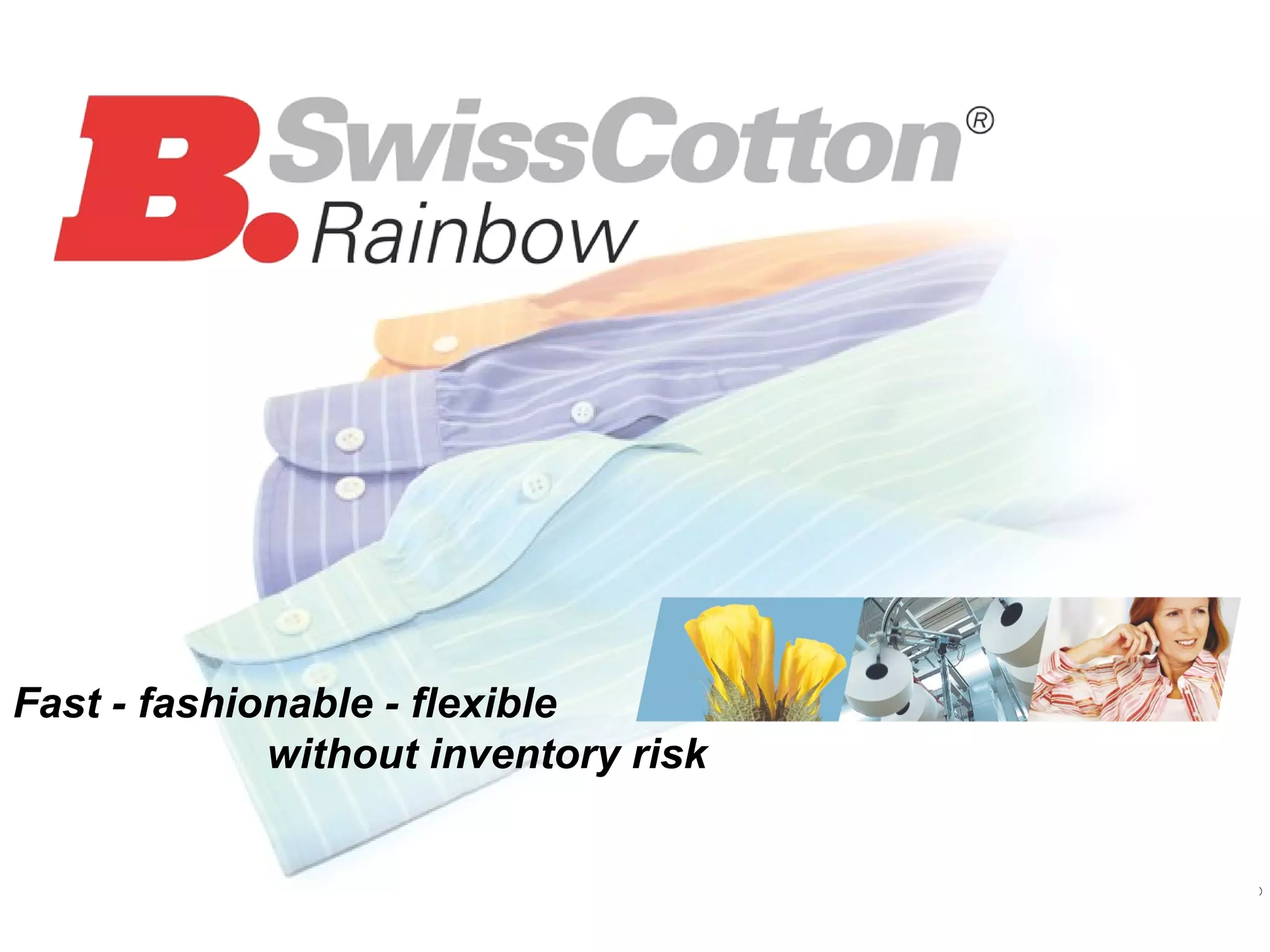 The document describes Rainbow-technology, which uses yarn with increased dye affinity to allow patterns and colors to be added after weaving, without needing to dye yarn or hold excess inventory. This allows for more flexible and rapid production of fashion items in various colors. The technology reduces costs for retailers and manufacturers by minimizing inventory and lead times. It also allows for small production runs of fashionable colored items.
