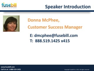 Donna McPhee, a Customer Success Manager at Fusebill, will provide an introduction to recurring billing and an overview of Fusebill's automated billing platform. Fusebill helps subscription businesses reduce costs, speed cash collections, and extend customer lifecycles by automating invoicing, billing, and collections. The presentation will cover recurring billing concepts, differences between payment platforms and gateways, how automated billing saves money, and Fusebill's specific pricing, account management, communication, and reporting features.