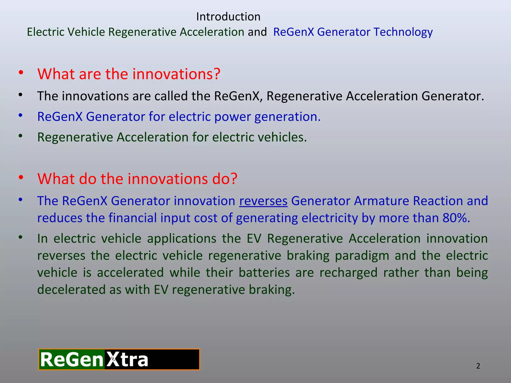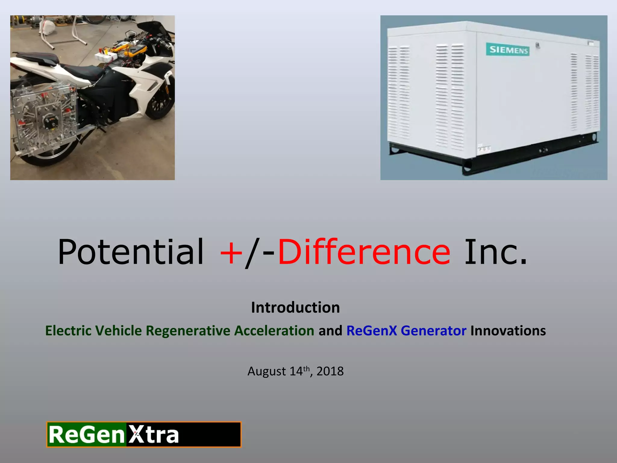 The document describes Potential +/-Difference Inc.'s ReGenX Generator and electric vehicle regenerative acceleration innovations. The ReGenX Generator reverses generator armature reaction, reducing electricity generation costs by over 80%. For electric vehicles, regenerative acceleration recharges batteries during acceleration instead of deceleration. Commercialization plans include developing 30MW and 800MW ReGenX Generators for a methanol plant by 2030. Siemens, GE, and Westinghouse may provide scale-up services.