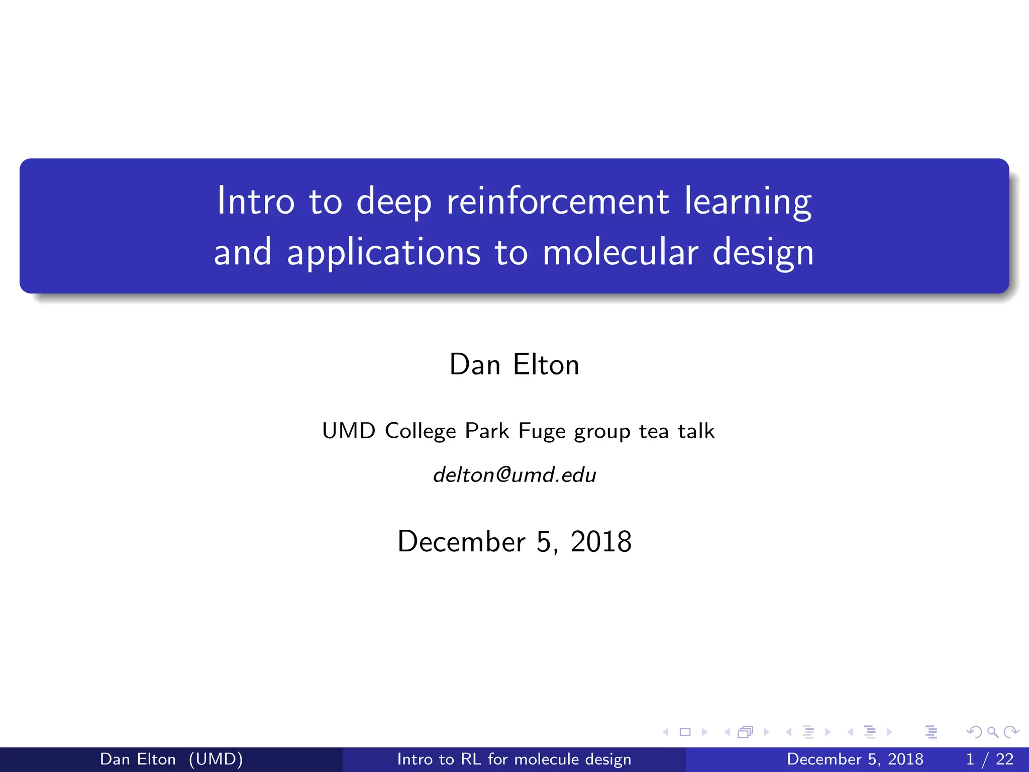 The document presents an introduction to deep reinforcement learning (RL) and its application in molecular design, covering concepts such as the Bellman equation, value function learning, and deep Q-learning. It highlights the methodologies used for molecular optimization through RL, including the design of reward functions and neural network architectures. The implementation details and the results of the approaches discussed aim to showcase the advantages and challenges in utilizing deep RL for optimizing molecular structures.