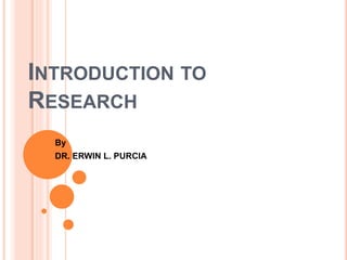 This document provides an introduction to research. It defines research as a systematic study that involves carefully collecting, analyzing, and interpreting data to relate thinking to reality. The scientific method involves recognizing a problem, collecting data through observation and experiment, and testing hypotheses. Good research is systematic, controlled, empirical, critical, logical, cyclical, analytical, methodical, and replicable. Characteristics of a good researcher include intellectual curiosity, prudence, healthy criticism, honesty, and creativity. Research is important for improving quality of life by addressing people's needs and problems through new inventions and technologies. There are different types of research like basic, applied, and developmental research, as well as different methods like library, field, and laboratory research.