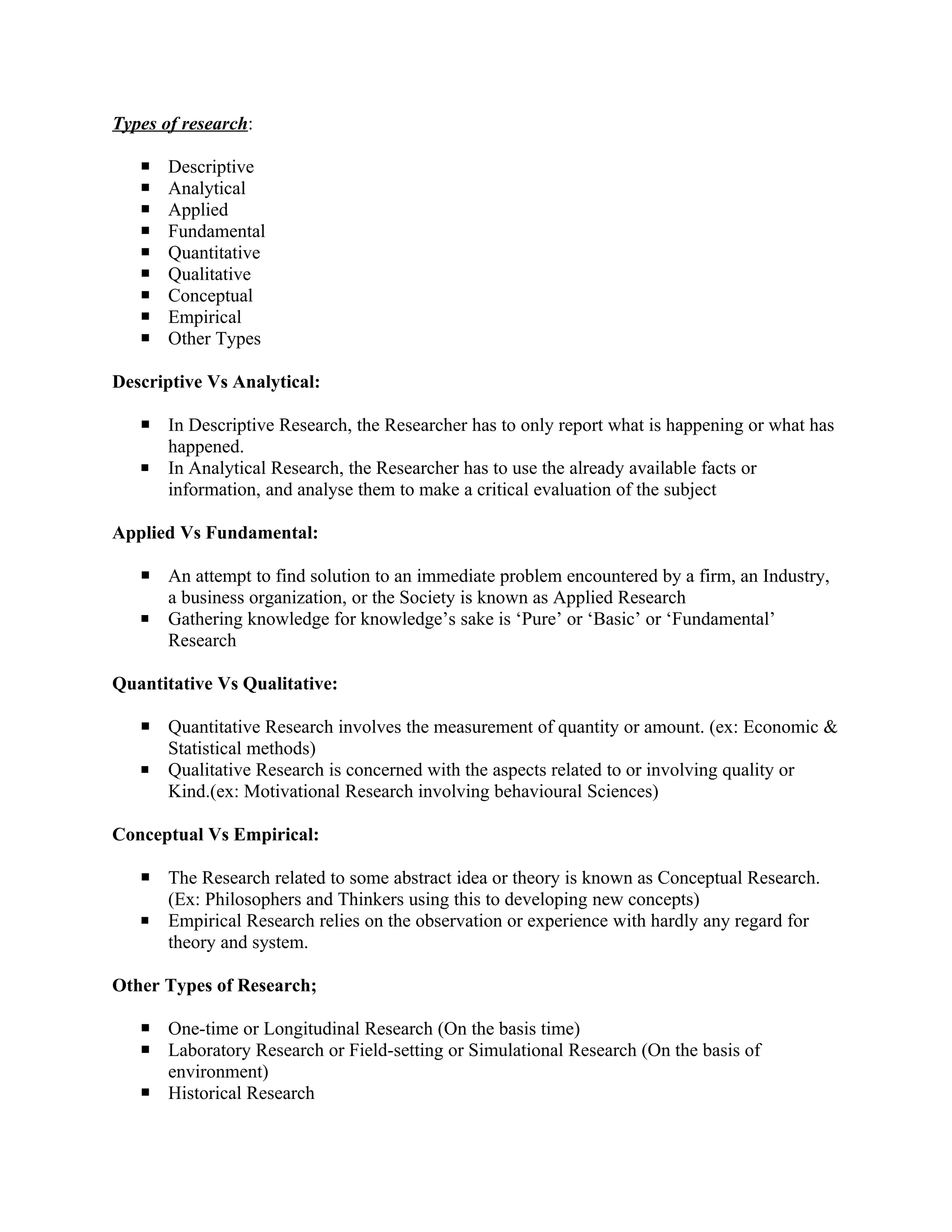 Research involves systematically gathering knowledge through objective methods. It aims to solve problems by defining issues, formulating hypotheses, collecting and analyzing data, and reporting conclusions. The key types of research are descriptive, analytical, applied, fundamental, quantitative, qualitative, conceptual, and empirical. Research requires carefully determining the scope, objectives, methods, and design to efficiently obtain reliable results and further knowledge.