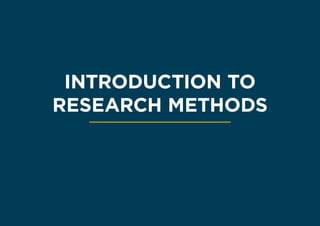 This document provides an introduction to research methods. It defines research as the systematic investigation into a subject to improve knowledge and understanding. Research can be conducted to learn about a subject, test a theory, make discoveries, or revise understanding. There are two main types of research: primary research, which collects original data through methods like surveys, interviews and experiments, and secondary research, which analyzes existing information from sources like books, websites and films. The research process should use appropriate methodology for the subject and include a variety of reliable sources. Effective research includes defining a field of study, research focus or question to guide the collection and analysis of information.