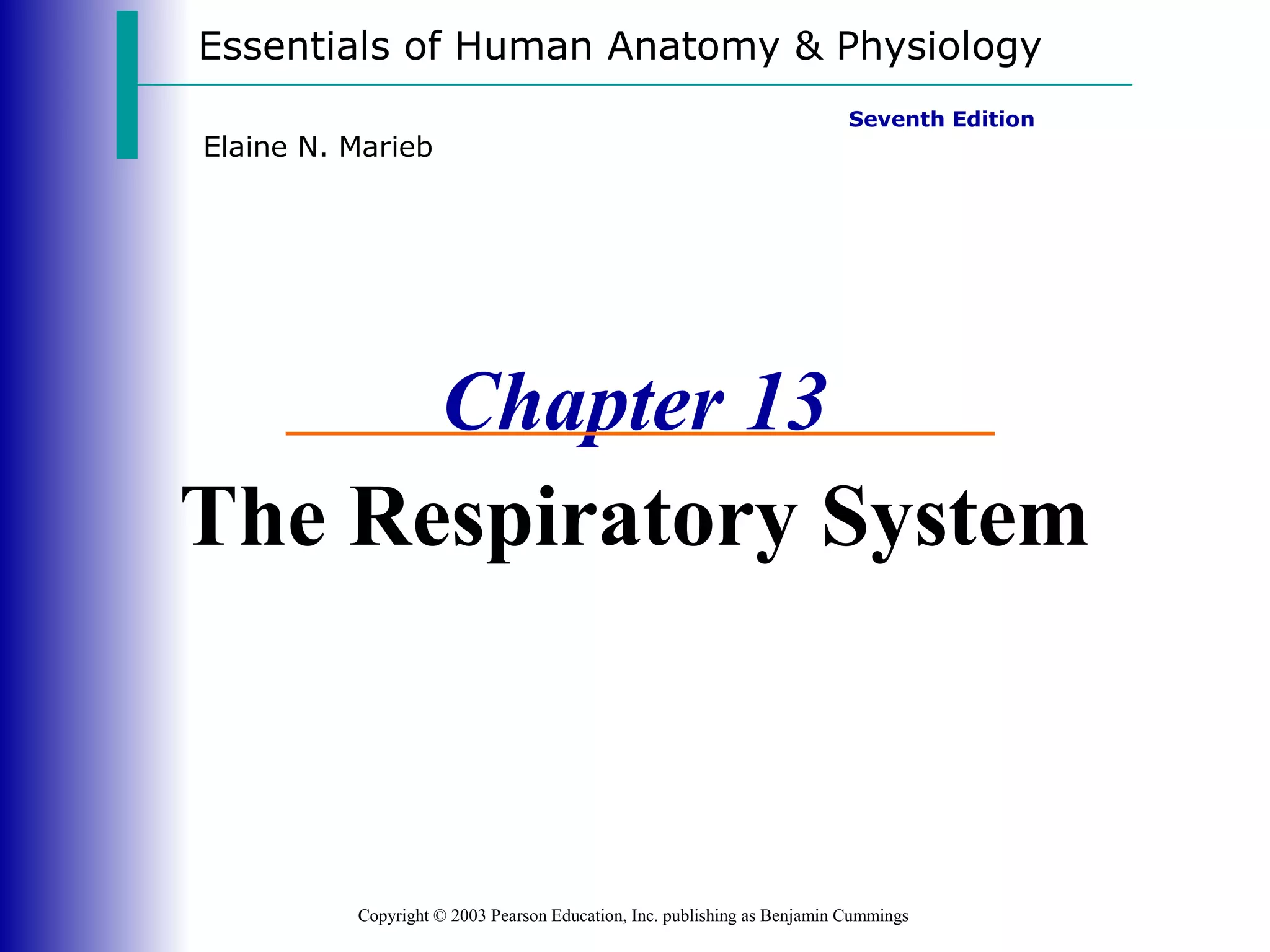 This document summarizes the key components and functions of the respiratory system. It describes the major organs involved, including the nose, pharynx, larynx, trachea, bronchi and lungs. It explains that gas exchange occurs in the alveoli of the lungs. It also outlines the mechanics of breathing, including inspiration and expiration. Pulmonary ventilation moves air in and out of the lungs, while external respiration is the gas exchange between the lungs and blood.