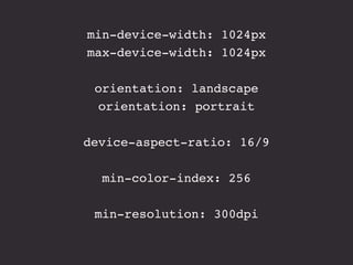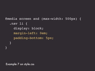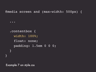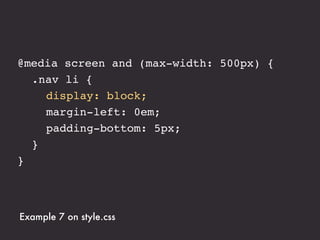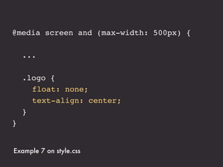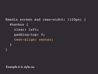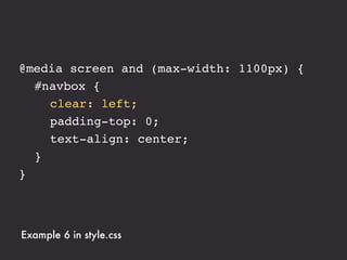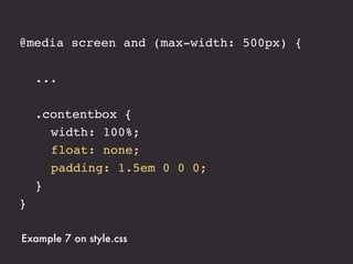 The document presents an introduction to responsive web design, outlining key techniques such as flexible grid layouts, flexible images, and media queries that allow websites to adapt to various devices. It emphasizes the importance of optimizing user experience across different platforms without creating separate sites for each device. Additionally, it discusses design approaches, resources for further learning, and practical examples of responsive design implementations.