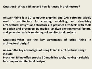 Rhino is a 3D computer graphics and CAD software used in architecture for modeling, visualizing, and prototyping designs, offering precision, parametric design capabilities, and digital fabrication support. The software allows for environmental analysis and generates realistic renderings, enhancing design communication. It distinguishes between NURBS, which provide smooth, mathematical representations suitable for complex shapes, and polygons, which are less precise and typically used in real-time graphics.