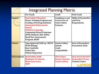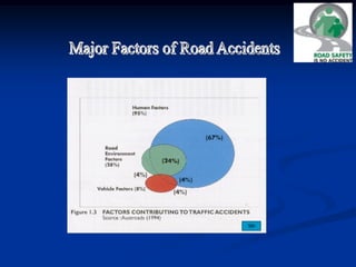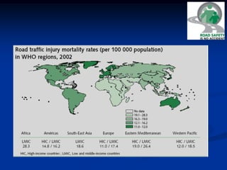 - An estimated 1.2 million people are killed in road accidents worldwide annually, with 20-50 million injured. Developing countries see 20-200 deaths per 10,000 vehicles while developed countries see 2-5 deaths.