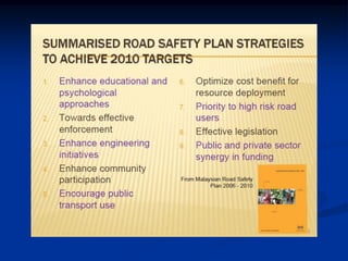 - Various strategies are used in Malaysia to reduce accidents and fatalities, including targeting high-risk locations,