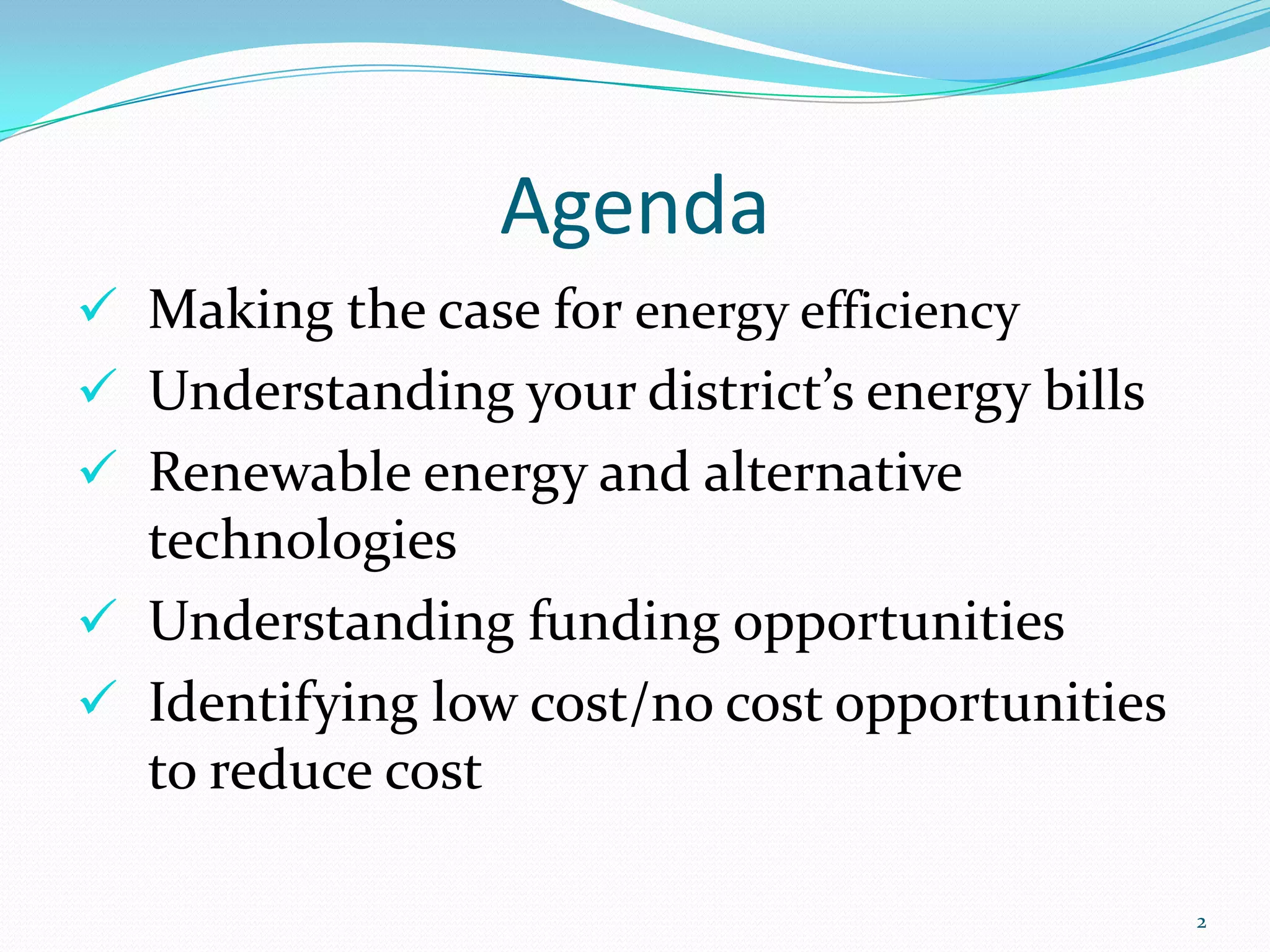 The document provides an overview of energy management for school districts. It discusses making the case for energy efficiency by outlining signs of energy waste in schools and potential savings from effective management. It also covers understanding energy bills, renewable technologies, funding opportunities, and developing an energy management plan. The key points are identifying low-cost opportunities to reduce costs, benchmarking to compare performance, and leveraging various funding sources like NYSERDA and utility programs.