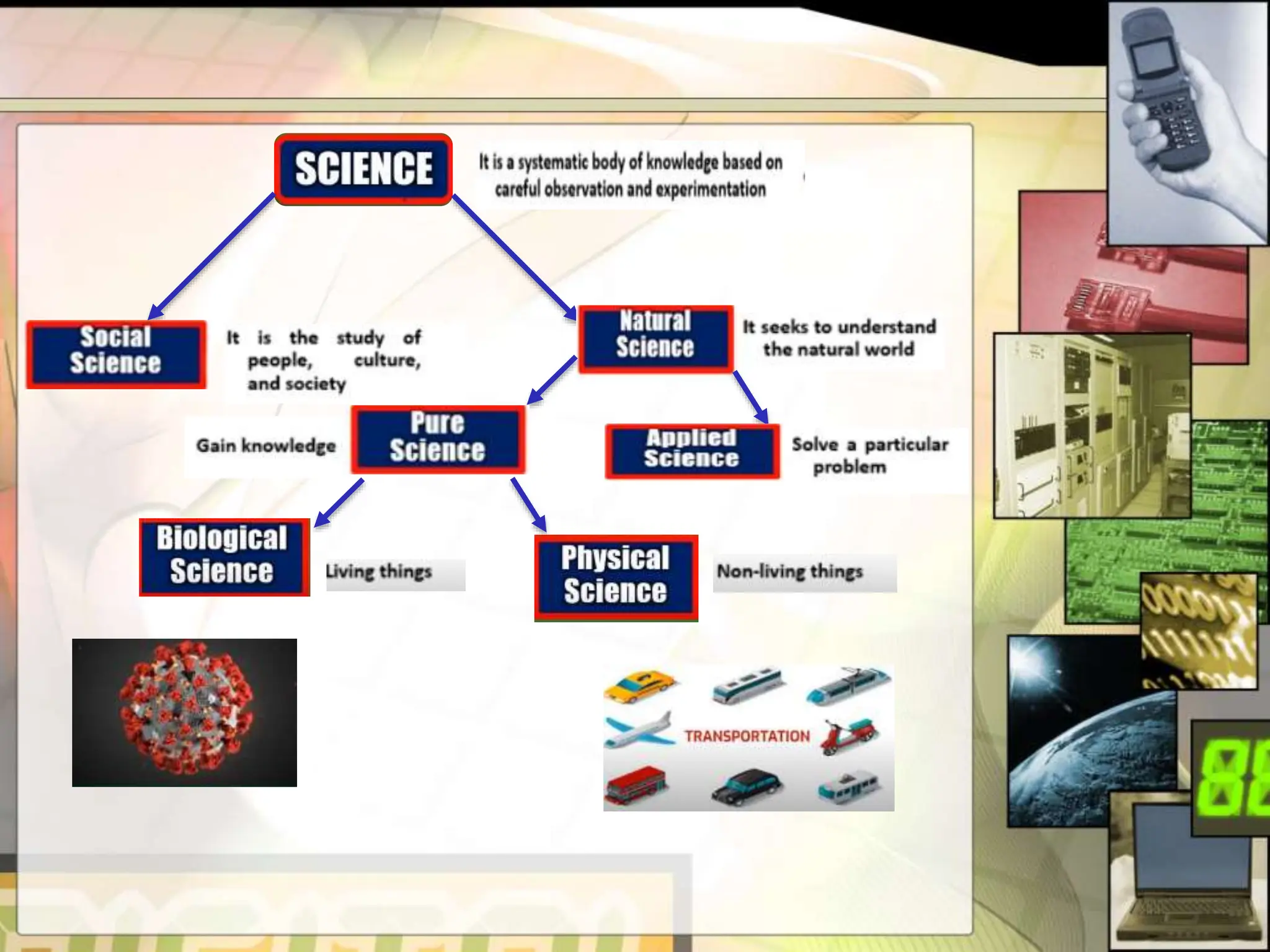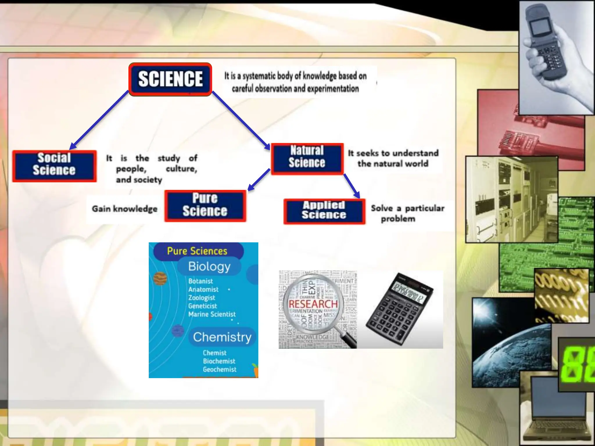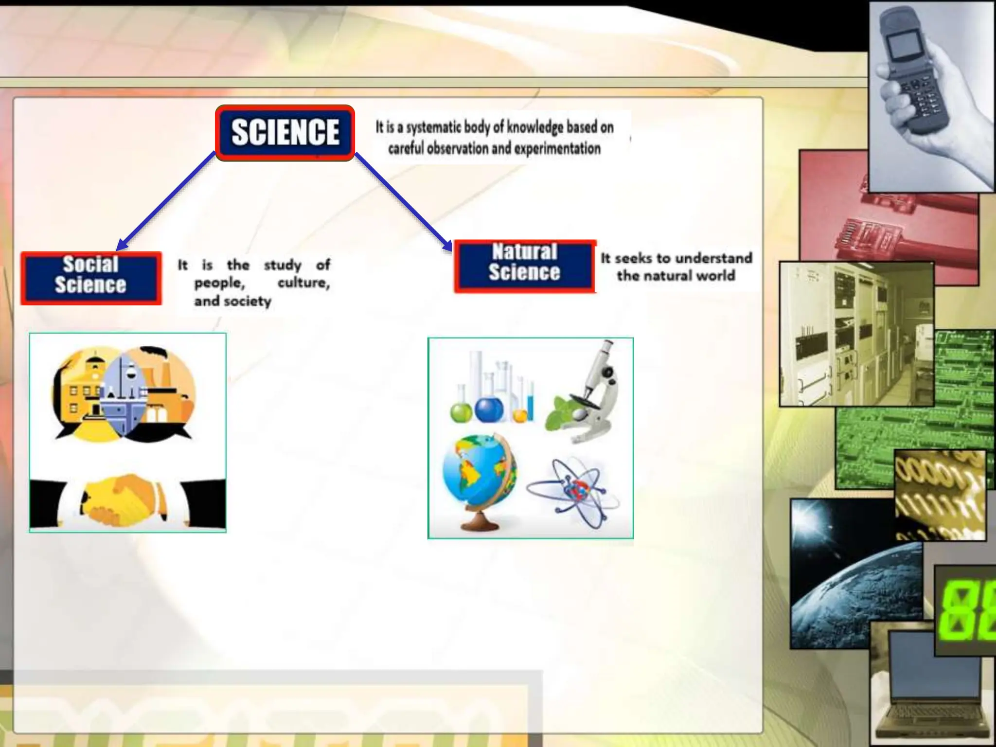 This document provides an introduction to science, technology, and society. It defines science as a systematic body of knowledge based on observation and experimentation. Technology refers to the application of scientific knowledge for practical purposes or to meet human needs. Society is defined as a large group that shares common culture, social structure, and laws within a geographical territory. The relationship between these three concepts - science, technology, and society - is the focus of science, technology, and society studies.