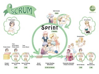 Scrum is a framework for developing products using short iterations called sprints, inspection and adaptation. The core roles are the product owner, scrum master, and team. The product owner manages the product backlog of requirements. The scrum master facilitates the team. The team is responsible for delivering increments of the product each sprint. There are three main artifacts: the product backlog, sprint backlog, and visible progress indicators. The process involves six activities: product backlog refinement, sprint planning, daily scrums, sprint review, retrospective, and delivery of an increment.