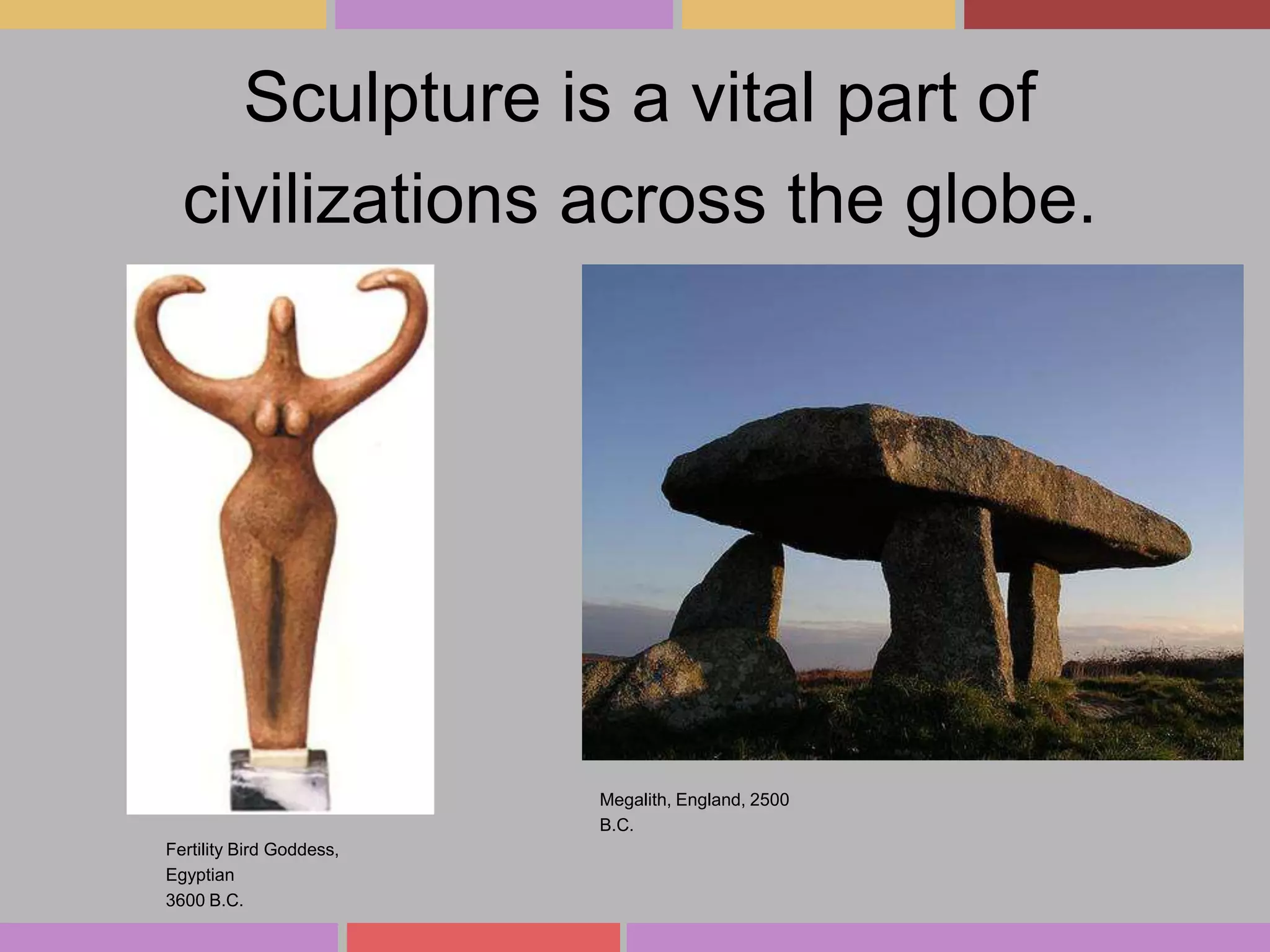 Sculpture has existed since prehistoric times, with early works created for religious or symbolic purposes. Major ancient civilizations like Egypt, China, Greece, and Rome produced sculptures that recorded both religious and political aspects of their societies. Techniques like carving, casting, constructing, and modeling were used. In subsequent eras, artists strived for perfection of the human form or moved towards abstraction. Contemporary sculptors continue redefining the art form using diverse materials and concepts. For a work to be considered sculpture, it must demonstrate skillful use of form, convey some message or emotion, and effectively employ sculpting techniques.