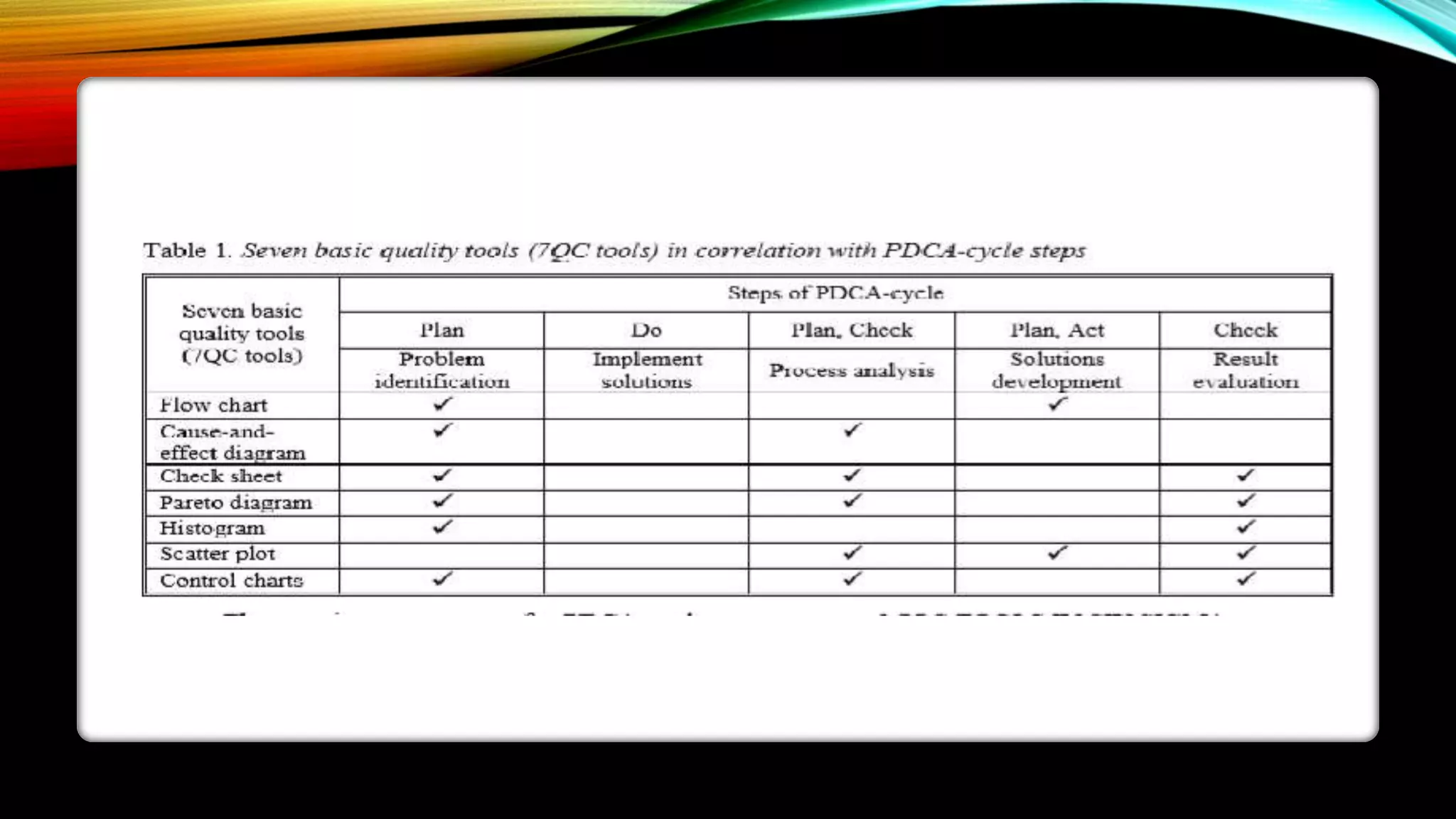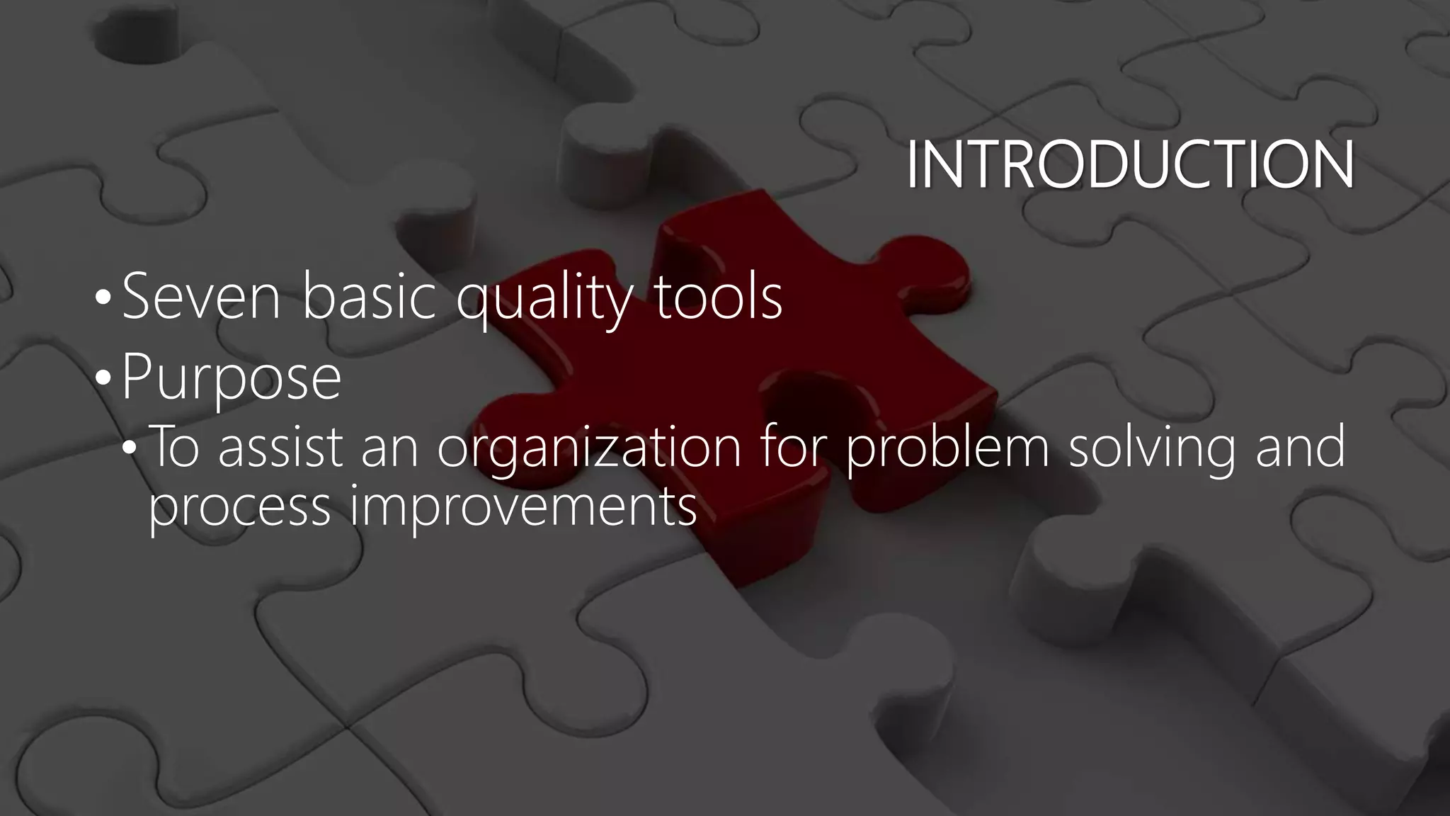 This document presents an overview of the seven basic quality tools introduced by Kaoru Ishikawa: flow chart, Pareto diagram, check sheet, control chart, histogram, scatter plot, and cause-and-effect diagram. Each tool is defined and an example is provided of how it can be used. The tools are designed to help average people analyze and interpret data to solve problems and improve processes.