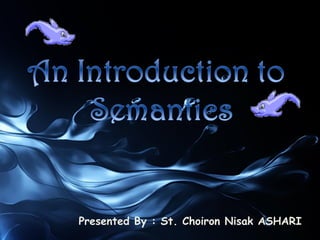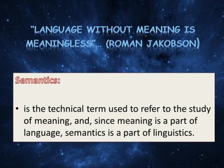 This document discusses the meaning and study of semantics. It provides definitions and explanations of key concepts in semantics, including symbol and referent, denotation and connotation, pragmatics, ambiguity, and semantic change. It also discusses subfields like lexical semantics and sentential semantics. As an example, it analyzes the sentence "Colorless green ideas sleep furiously," which was originally presented as meaningless but is argued to poetically describe new, dull ideas circulating unconsciously.