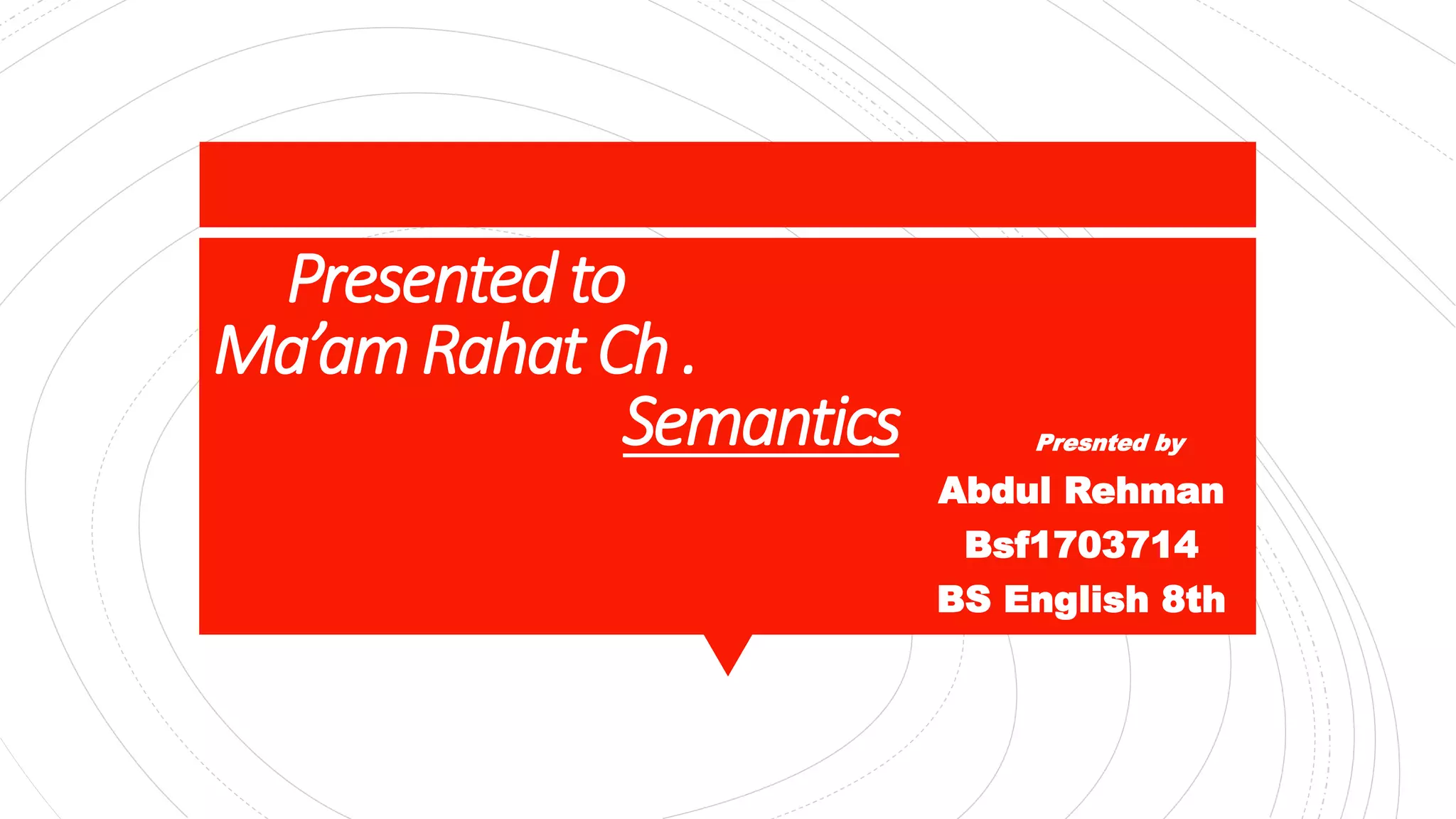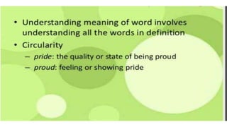 The document presents a study of semantics and its key concepts, such as meaning, ambiguity, entailment, and contradiction, along with discussions on semotics and the relationship between signs and their meanings. It highlights the issues in definition theory, including circularity and the distinction between linguistic and encyclopedic knowledge. Additionally, it explores the differences between cognitive and generative grammar, as well as the importance of context in understanding language.