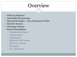 This document provides an introduction to sensors, including definitions of key terms like sensors, transducers, and actuators. It describes different types of sensors such as temperature sensors, accelerometers, light sensors, and ultrasonic sensors. It explains various sensor principles including how sensors can be classified as active or passive, contact or non-contact, and absolute or relative. The document also discusses choosing sensors and interfacing sensors with electronics.