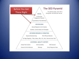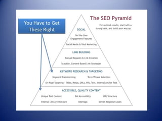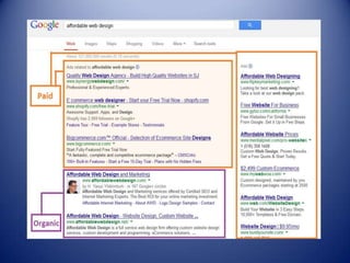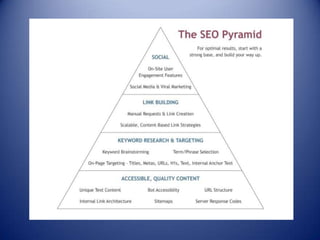 SEO is the process of optimizing a website to increase organic traffic from search engines. It involves both on-page techniques like optimizing content and keywords, and off-page techniques like link building. The goal of SEO is to get a website highly ranked in search engine results pages (SERPs) for targeted keywords so it receives more visitors, and ultimately more conversions. When search engine spiders crawl and index a website, they calculate its page rank and display results based on relevance to search queries.
