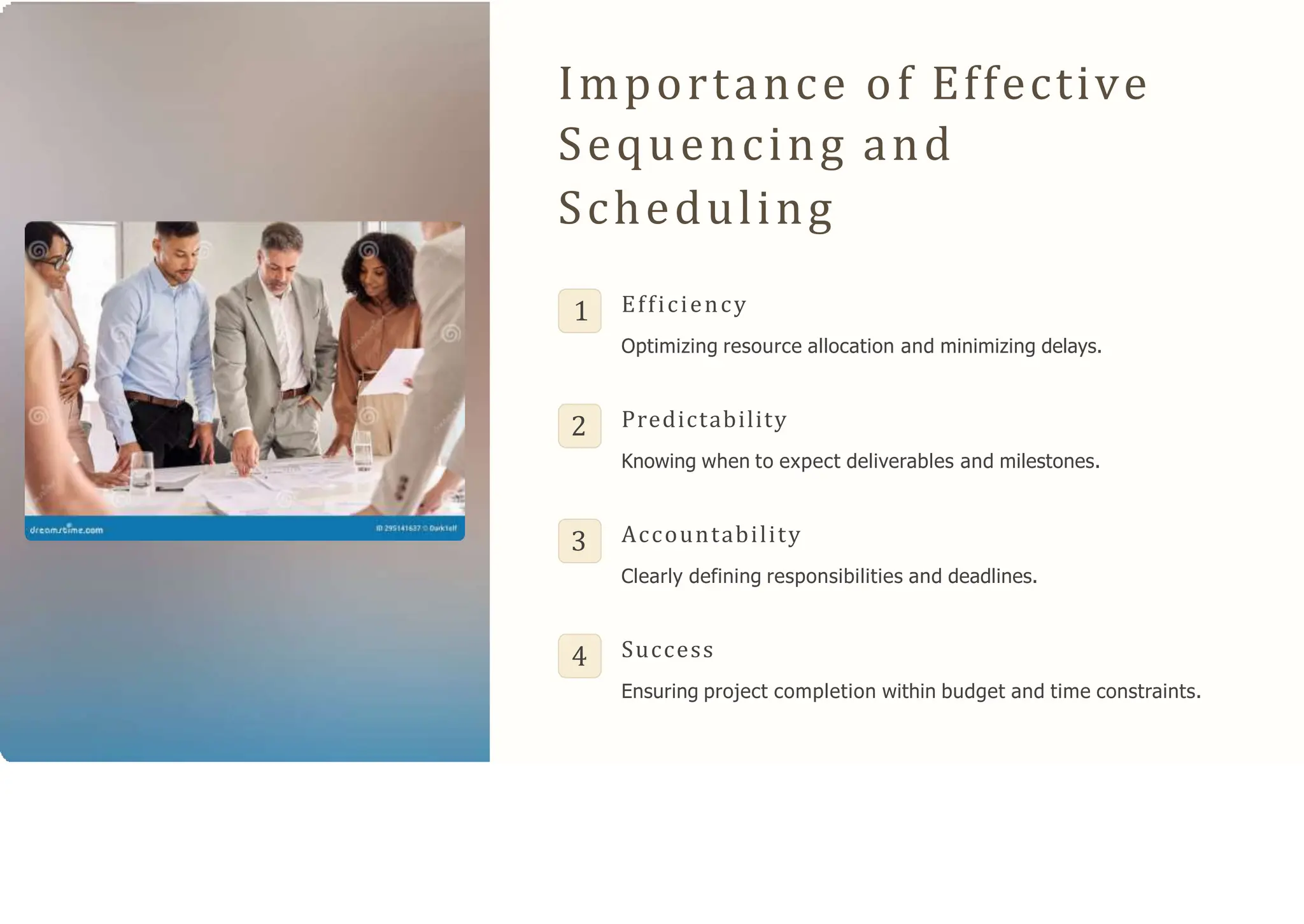 Sequencing and scheduling are essential project management concepts aimed at arranging tasks and meeting deadlines to ensure efficiency and accountability. Techniques such as critical path method, Gantt charts, and risk management strategies enhance resource utilization and address uncertainties. Continuous improvement through performance evaluation and process optimization is crucial for refining scheduling practices.