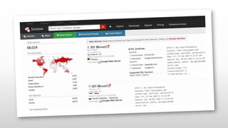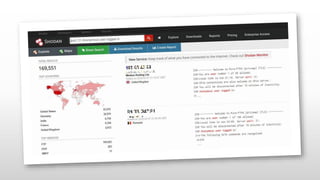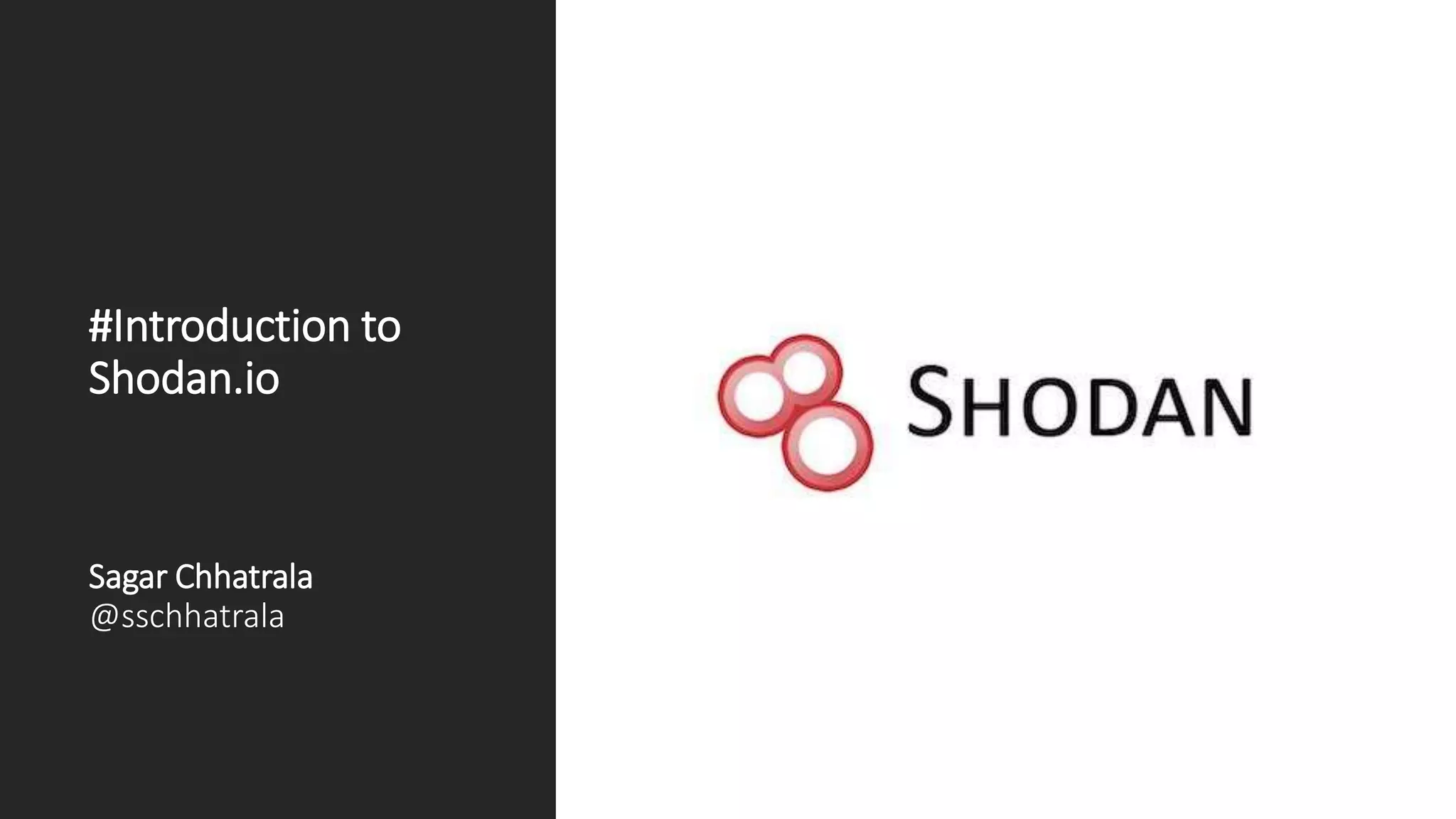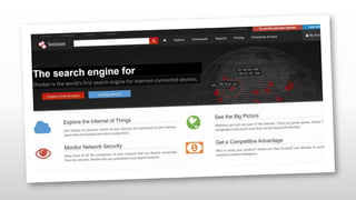 Shodan is a search engine that indexes internet-connected devices and provides information about devices, banners, and metadata. It works by generating random IP addresses and port scans to retrieve banner information from devices. This information is then stored in a searchable database. Users can search Shodan's database using filters like country, city, IP address, operating system, and ports. Shodan can be accessed through its website or command line interface. While useful for security research, Shodan also raises privacy and security concerns by revealing information about unprotected devices.