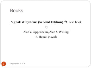 This document provides an overview of signals and systems from the Department of Electronics and Communication Engineering at Avinashilingam Institute. It defines a signal as a physical quantity that describes how one parameter varies with another over time or space. Examples of signals include electrical, acoustic, mechanical, video and image signals. Signals can be represented mathematically as functions of time or other variables and can be continuous or discrete. A system is defined as an entity that responds to a signal, transforming the input signal to an output signal. The relationship between input and output signals of a system can be represented using block diagrams or as the convolution of the input signal with the system's impulse response.