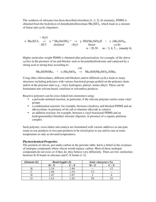 This document provides an introduction to silicone chemistry. It discusses the structure and properties of polydimethylsiloxanes (PDMS), the most common type of silicone polymer. PDMS has a backbone of alternating silicon and oxygen atoms with methyl groups attached. This gives silicones a combination of inorganic stability from the silicon-oxygen bonds and organic flexibility from the methyl groups. As a result, silicones have unique properties including resistance to heat and weathering. The document outlines silicone nomenclature and synthesis methods and describes how silicones' physicochemical properties, including low surface tension and glass transition temperature, arise from the structure.