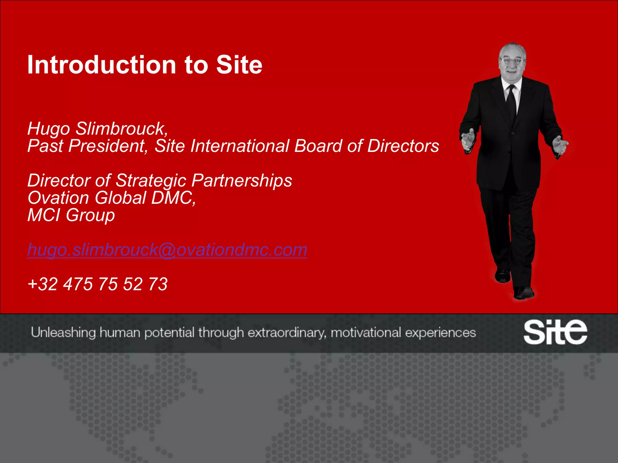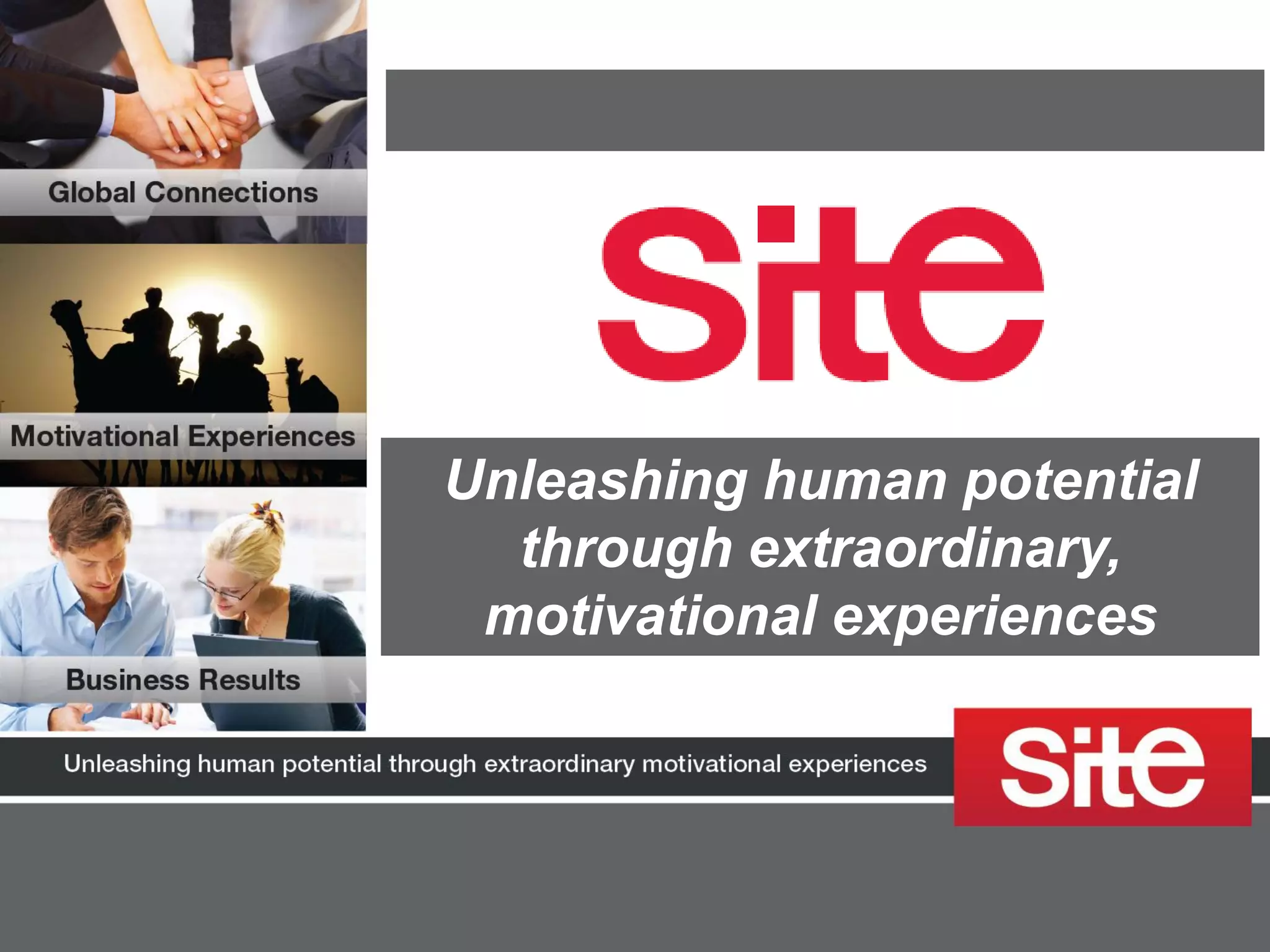 Site is a global network that connects motivational experiences to business results. It aims to unleash human potential through extraordinary experiences. Site has a global membership of professionals in incentive companies, destination management companies, accommodations, and other related fields. Members gain access to networking opportunities, industry insights, tools and resources to help maximize the business impact of motivational experiences. Site also offers educational programs and volunteer leadership opportunities to further professional development.