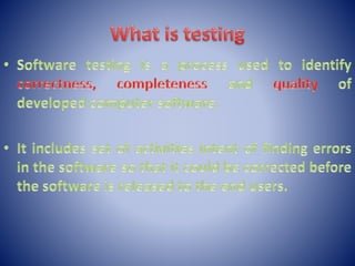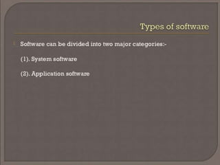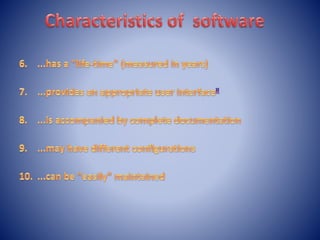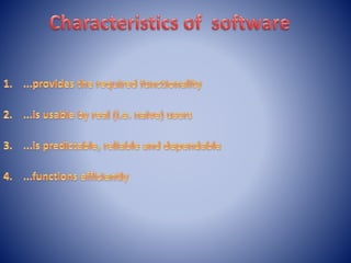 This document provides an overview of Module 1 of an introduction to software concepts course. It covers the following topics: definitions of software, importance of software, types of software, software components, members involved in software development, and an overview of the software development life cycle (SDLC). Specifically, it defines software, discusses why it is important, lists common software types and components. It also outlines the roles of various members in software development projects, such as subject matter experts, functional analysts, developers, testers, and project managers. Finally, it provides a high-level overview of the waterfall model for the SDLC.