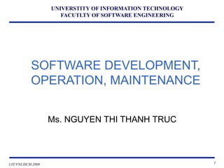 This document discusses software system operation, maintenance, and management. It covers topics like resource management, problem management, facilities management, security management, and cost management as they relate to system operation. Maintenance is described as modifying a system after development to fix bugs, update specifications, or improve functionality. Effective maintenance requires communication between users and developers, tracking issues, analyzing problems, and documenting changes. The document provides details on maintenance tasks, types of maintenance work, and factors that influence maintenance costs.