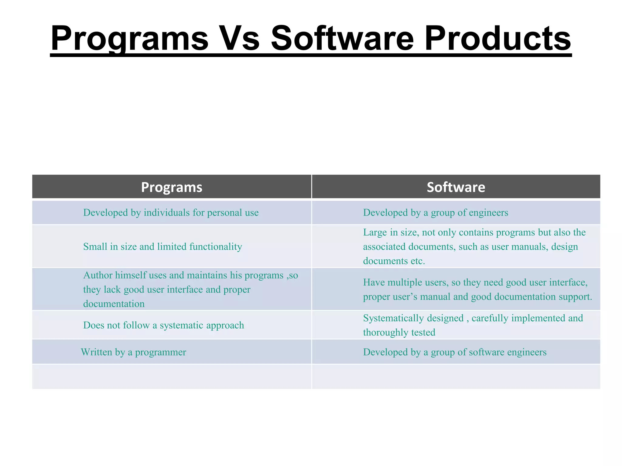 1. The differences between programs and software products. Software products are larger, have multiple users, and follow a more systematic development process.