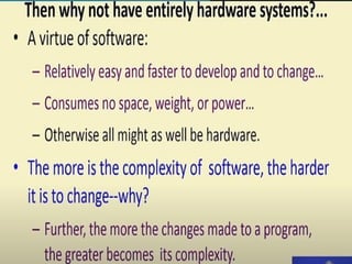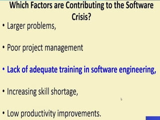 The document presents an introduction to software engineering by Prof. Danish Ali, covering key topics such as software development life cycle (SDLC), design models, and project management. It outlines important aspects including requirement analysis, cost estimation, software testing, and maintenance. The presentation emphasizes the significance of quality management and reusability in software engineering.