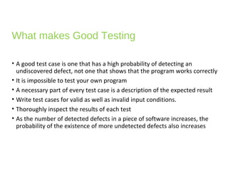 The document provides an overview of software testing principles, emphasizing the importance of effective test cases, various testing levels, and techniques such as unit, integration, and acceptance testing. It outlines the necessity of thorough validation and regression testing, as well as the involvement of customers in alpha and beta testing. Additionally, it describes the components of a test plan, estimation, procedures, and reporting to ensure comprehensive software quality assurance.