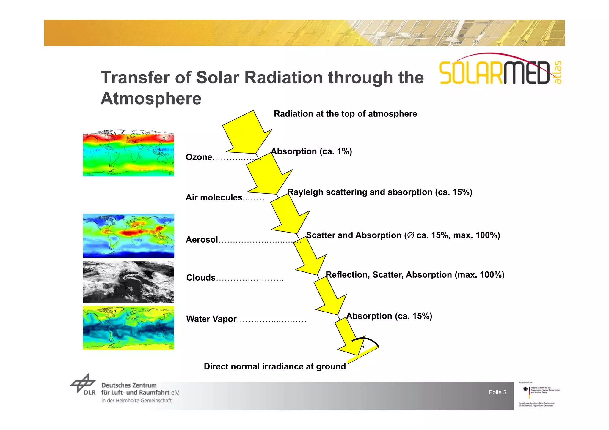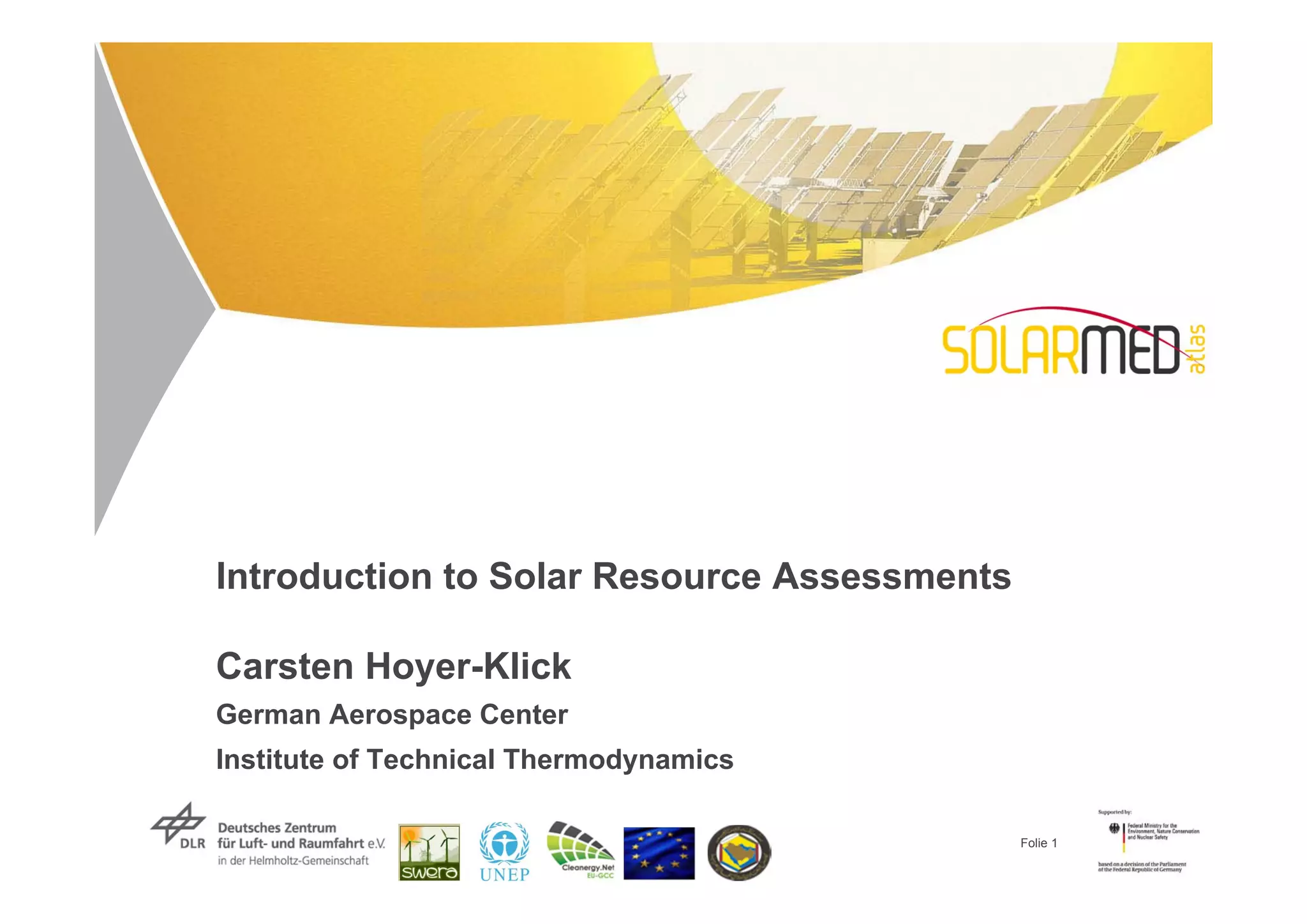 The document introduces solar resource assessments through satellite data. It discusses how satellites like Meteosat scan the Earth's surface to measure solar irradiance, and how these measurements are used along with atmospheric models and ground data to estimate solar resources. Key factors that influence solar radiation reaching the surface like aerosols, clouds, and water vapor are also summarized. The document then shows how satellite data can be used to analyze solar potentials and identify prime areas for solar technologies.