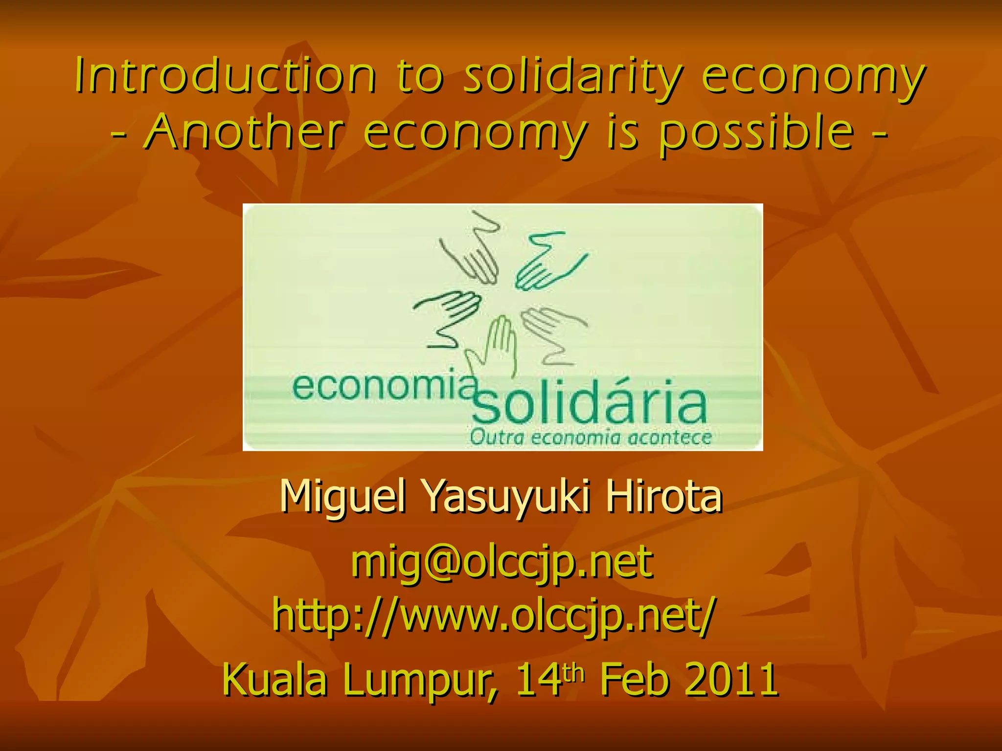 The document introduces the concept of solidarity economy (SE) as an alternative to capitalism that democratizes the economy. Key aspects of SE discussed include ethical banks where savers choose how money is used, worker cooperatives owned and operated by employees, and participatory budgeting where citizens decide local government spending. The development of SE is described in various regions, and strategies proposed to further SE in Asia include creating national networks to connect stakeholders, developing a wiki to share SE information, and increasing collaboration with Latin America where SE is more established.