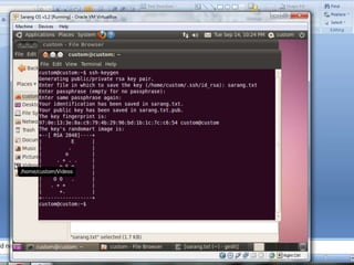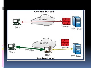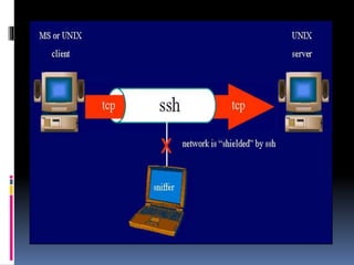 This document provides an introduction to SSH and PGP protocols for secure communication. It discusses how SSH uses public-key cryptography to authenticate connections and encrypt data transmitted over untrusted networks, protecting against threats like IP spoofing. It also explains how SSH uses key pairs and configuration files. PGP is introduced as providing encryption, authentication and integrity for email through techniques like hashing, symmetric/asymmetric encryption and digital signatures. It describes how PGP handles the technical challenges of encoding encrypted data for transmission in email systems.
