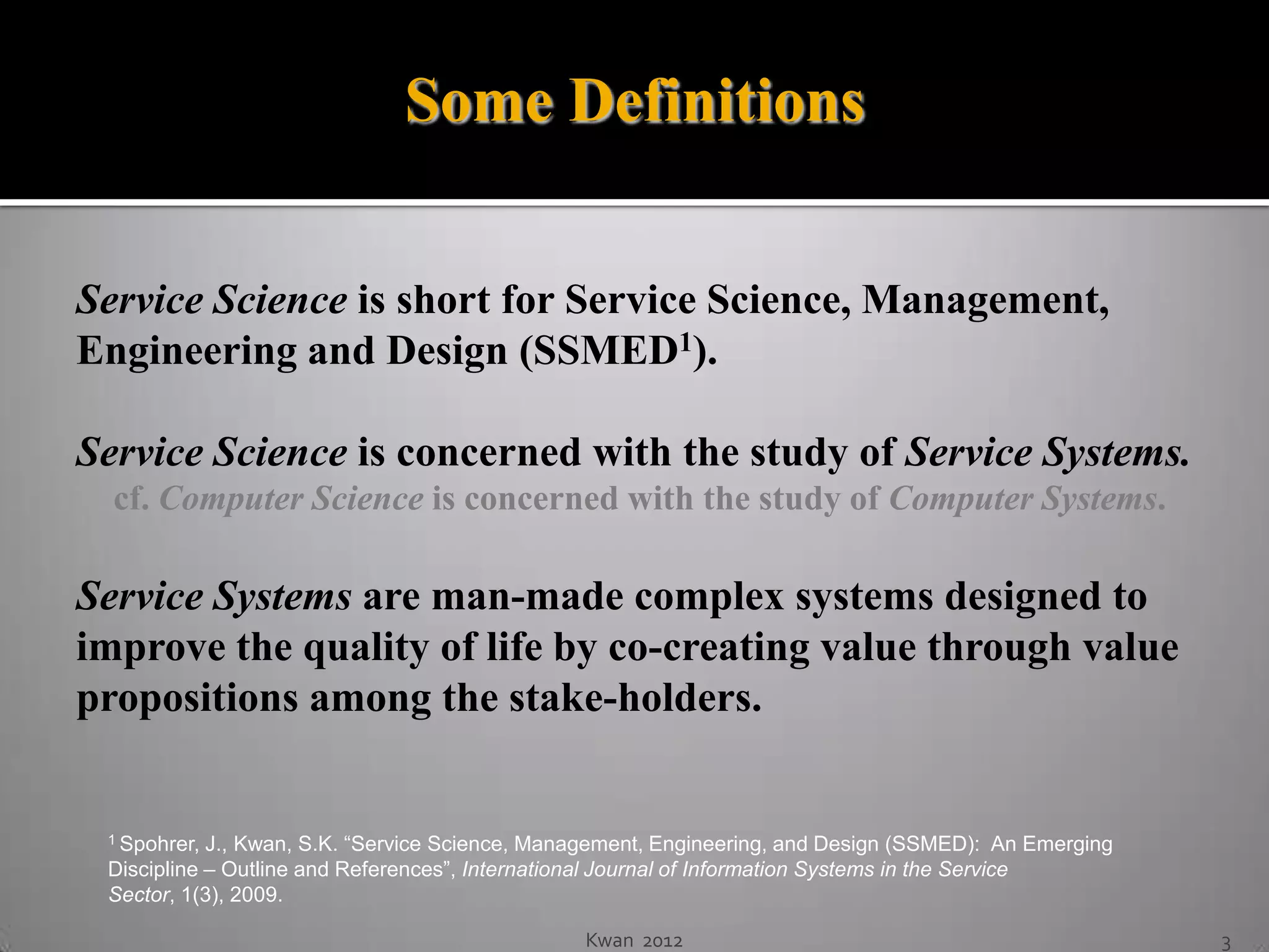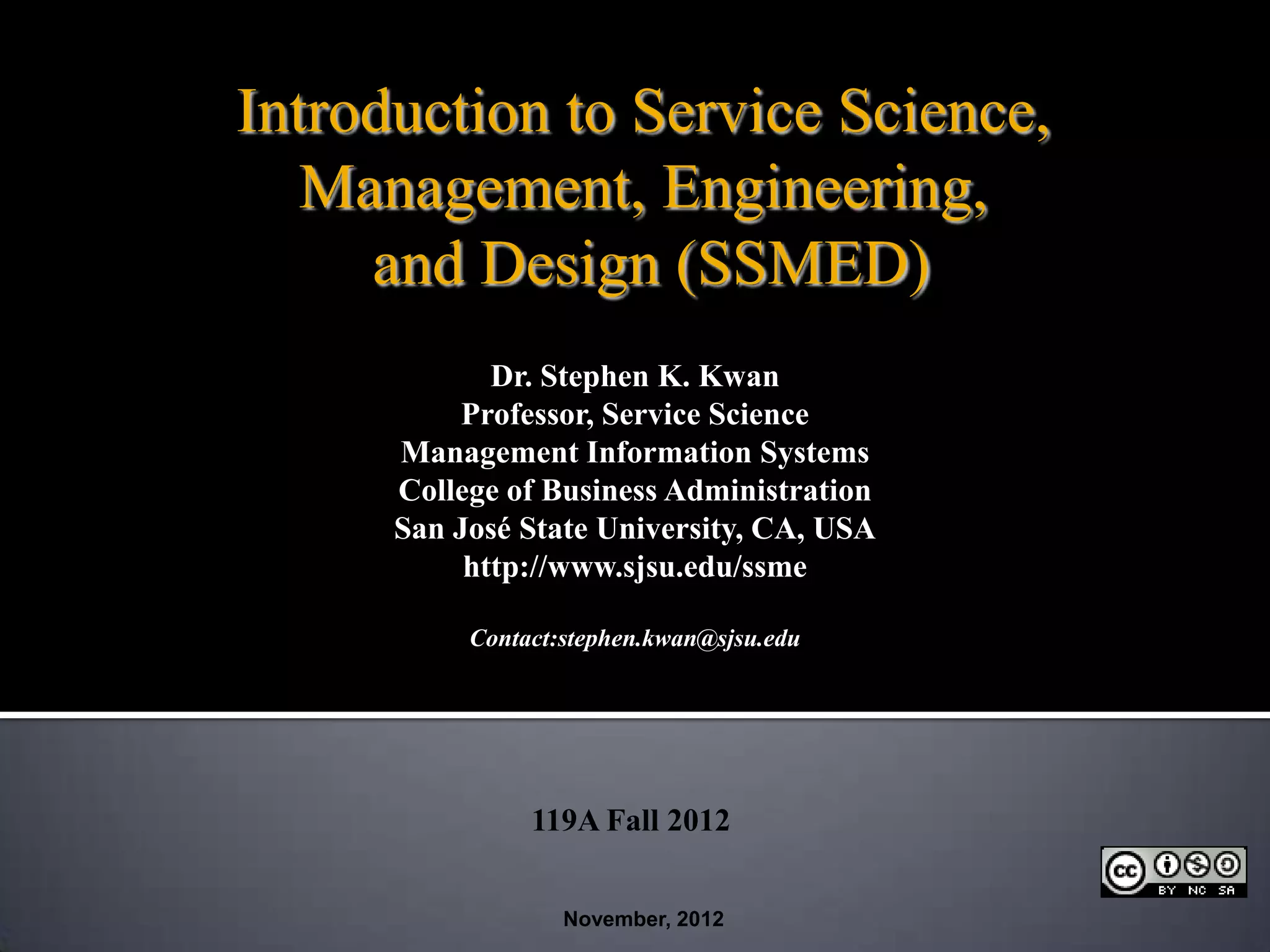 This document provides an introduction to service science, management, engineering, and design (SSMED). It defines key concepts such as service science, service systems, and value co-creation. It also discusses the growth of the global service sector and gives examples of industries engaging in SSMED. Finally, it outlines a proposed spring 2013 elective course on service systems management.