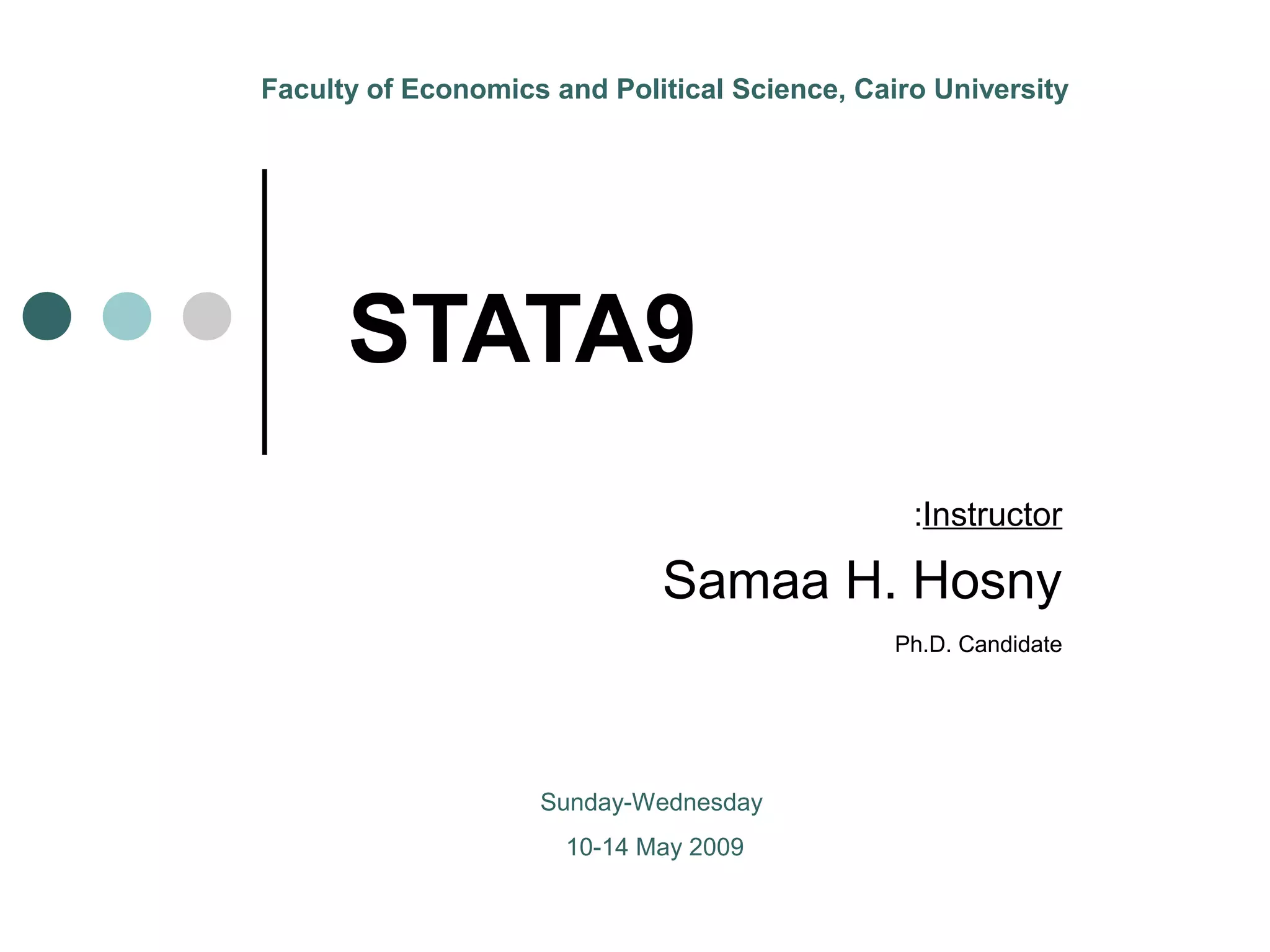 The document is a comprehensive overview of Stata software usage in social science research, detailing its interface, capabilities compared to SPSS, and various editions. It provides practical guidance on data manipulation, statistical analysis, graphics, and report preparation using Stata commands. Additionally, it includes best practices and tips for effectively managing and analyzing data within the software.
