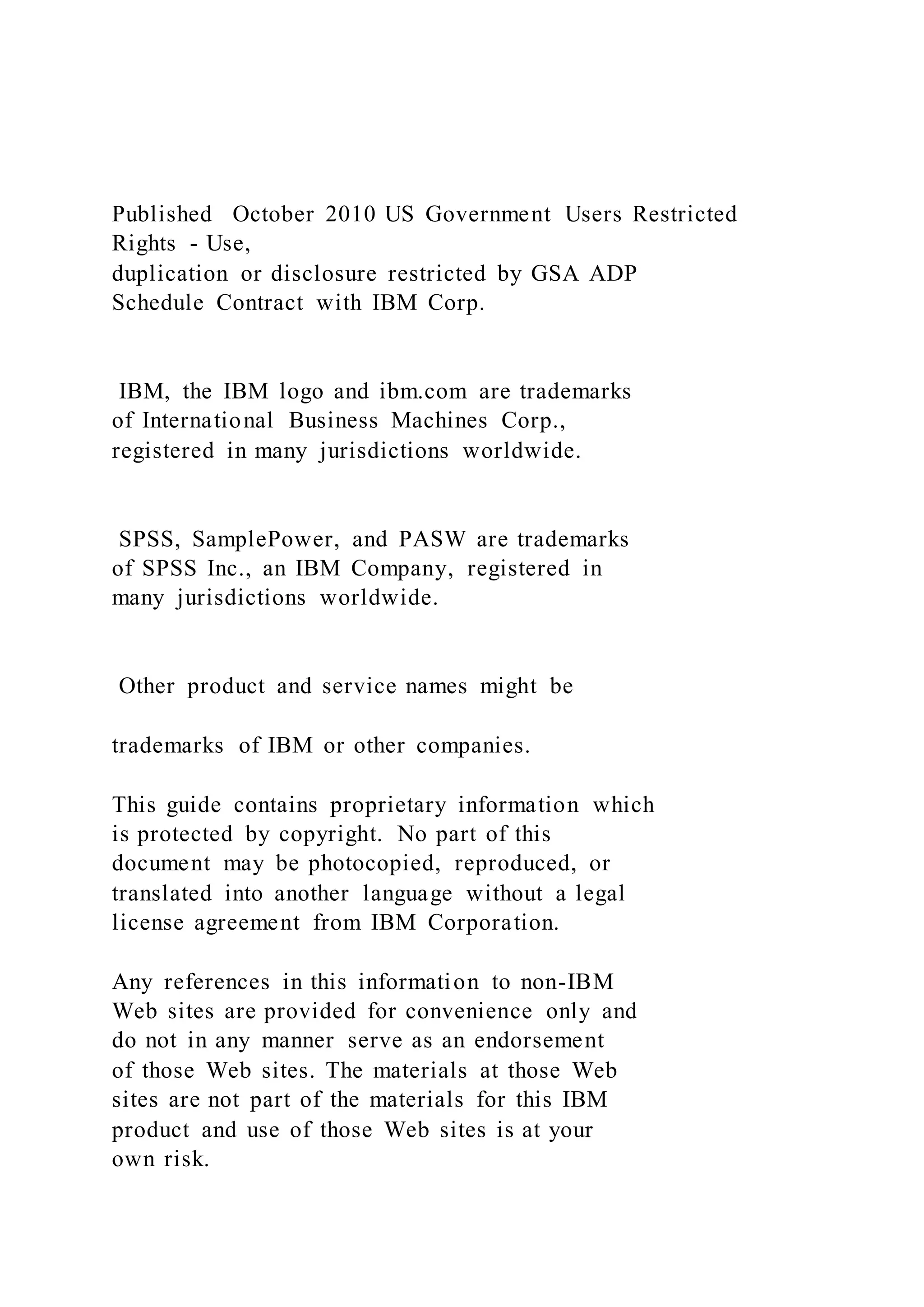 This document serves as a student guide for a course on statistical analysis using IBM SPSS Statistics, covering various statistical techniques and their applications. It includes lessons on data distributions, inferential statistics, hypothesis testing, and regression analysis, along with practical activities to reinforce learning. The guide is proprietary to IBM and includes restrictions on reproduction and distribution.