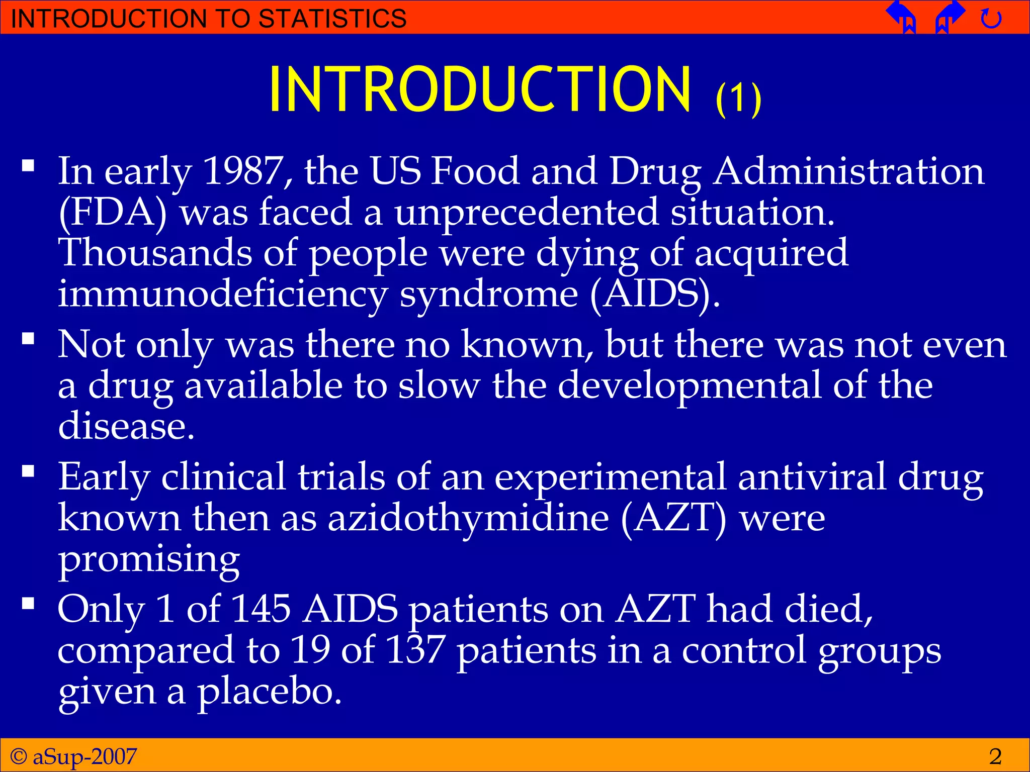 The document discusses the approval of the drug AZT to treat AIDS in 1987. It describes how early clinical trials showed AZT significantly reduced deaths among AIDS patients compared to a control group. However, statistical analysis was needed to determine if the results were due to the drug or chance. Statistical tests found the probability the results were due to chance was less than 1 in 1000. Armed with this evidence, the FDA approved AZT after only 21 months of testing.
