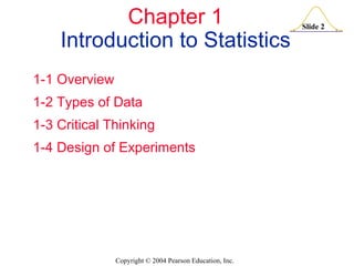 This document summarizes key concepts from an introduction to statistics textbook. It covers types of data (quantitative, qualitative, levels of measurement), sampling (population, sample, randomization), experimental design (observational studies, experiments, controlling variables), and potential misuses of statistics (bad samples, misleading graphs, distorted percentages). The goal is to illustrate how common sense is needed to properly interpret data and statistics.