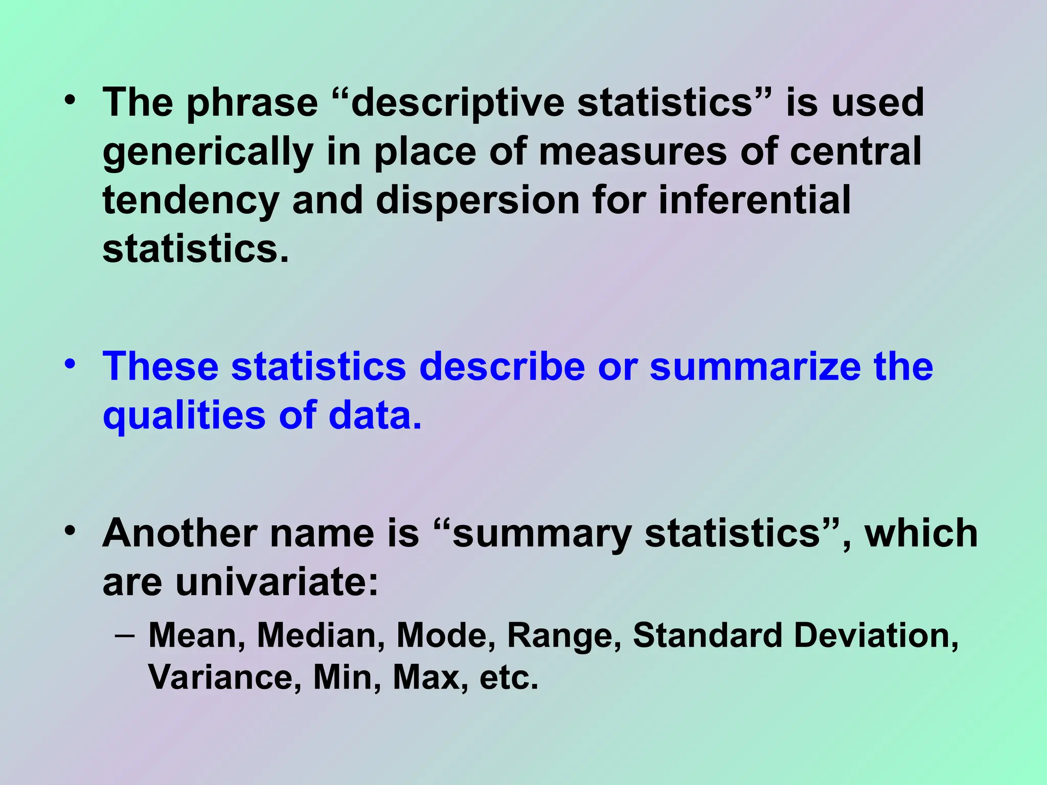• The phrase“descriptive statistics” is used
