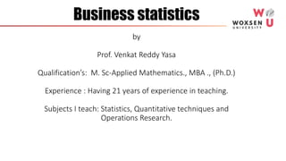 This document provides an introduction to business statistics by Prof. Venkat Reddy Yasa. It defines statistics as the science of decision making with calculated risks in the face of uncertainty or the collection, presentation and interpretation of data. The history and origin of statistics is discussed from the 18th century where it referred to state data collection to the 19th century where systematic data collection and analysis emerged. Modern statistics plays a key role in business, industry, science, economics, and other fields through data analysis. Descriptive and inferential statistics are introduced along with common statistical software used for analysis. Limitations of statistics are also noted.