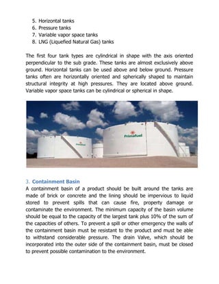 This document provides an introduction and overview of different types of storage tanks. It discusses 8 main types of storage tanks: fixed-roof tanks, external floating roof tanks, internal floating roof tanks, domed external floating roof tanks, horizontal tanks, pressure tanks, variable vapor space tanks, and LNG storage tanks. Each tank type is designed for storing different types of liquids and gases and has distinct features such as floating roofs, fixed roofs, insulation, and sizes that can range from meters to over 100 meters in diameter. The document also discusses containment basins, which storage tanks are often placed inside of to contain spills.
