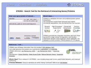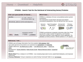 STRING integrates diverse evidence about functional interactions between proteins from hundreds of proteomes. It combines data from genomic context methods, curated databases, experiments, and textmining to generate a global network of protein interactions. The different evidence sources have issues like inconsistent identifiers, variable quality, and coverage of different species that STRING addresses through parsers, orthology transfer, and quality scores to generate a single confidence score for each interaction.