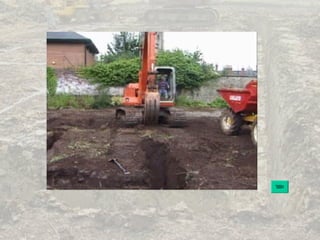 Strip foundations are the simplest and cheapest form of foundation for modern detached houses. They support all load-bearing walls, including external cavity walls and some internal walls that help support floors. Foundations are formed using concrete poured into excavated trenches. Proper excavation depth is important and ensured using tools like boning rods and levels. Foundation width depends on building load and ground conditions.