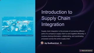 Supply chain integration involves connecting different parts of a company's supply chain to enhance efficiency, customer satisfaction, and profitability through collaboration and information sharing. Key components include demand planning, inventory management, production planning, and distribution, while challenges involve data silos and process complexity. Successful integration requires clear goals, trust-building, technology investment, and continuous improvement, along with measuring performance through key performance indicators.