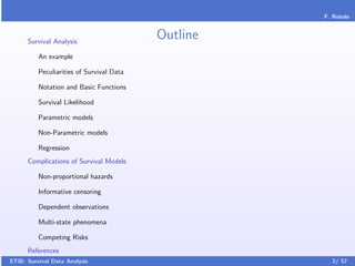 This document provides an introduction to survival data analysis. It discusses key concepts like censoring, where the event of interest is not observed for some subjects due to other events. Right censoring is common, where the event was not observed by the end of the study. Conditioning is also important, where the risk of an event changes over time based on a subject's survival up to that point. Basic notation is introduced, including the survival function, hazard function, and density function for modeling event times. The document outlines topics like parametric and non-parametric models, regression methods, and complications in survival analysis.