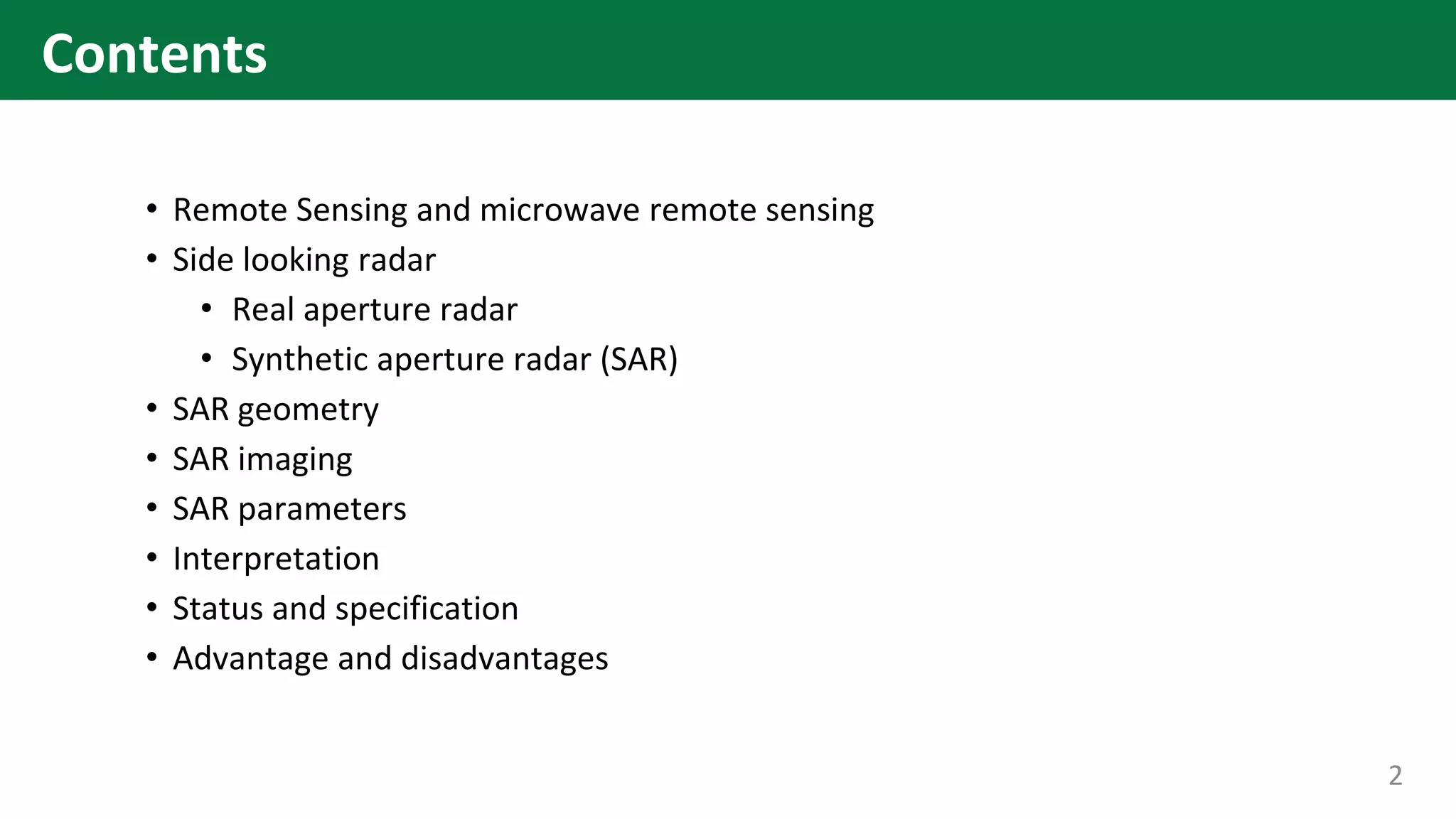 The document provides an introduction to Synthetic Aperture Radar (SAR) and various remote sensing technologies, detailing how SAR synthesizes larger antenna sizes to enhance azimuth resolution. It discusses the operational mechanics of SAR, including parameters affecting radar imaging, types of radar systems, and the characteristics of radar signals regarding frequency and polarization. Additionally, it outlines the advantages and disadvantages of SAR technology along with applications and data formats relevant to SAR satellite missions.